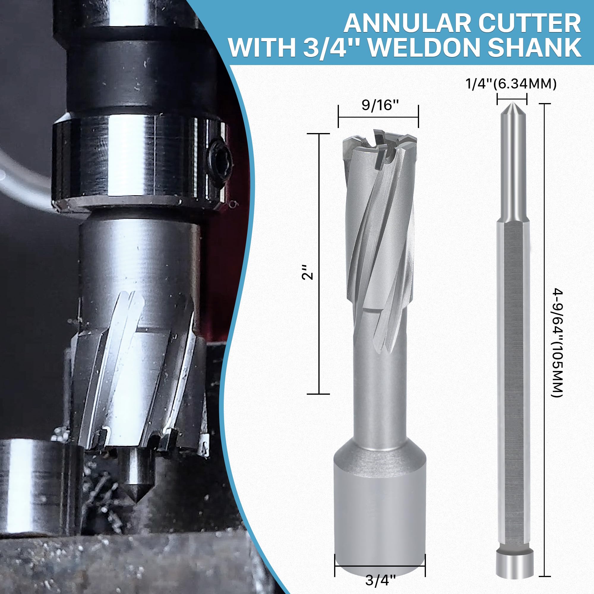 【Specifications】 - KEENTECH Annular Cutter features a premium carbide cutting edge for outstanding durability, making it ideal for drilling harder materials like stainless steel. It offers a 9/16" cutting diameter and a 2" cutting depth, and comes with a free pilot pin. The 3/4" weldon shank design is compatible with various magnetic drills, including but not limited to Alfra, Evolution, Dewalt, Vevor, Zelcan and Hougen.