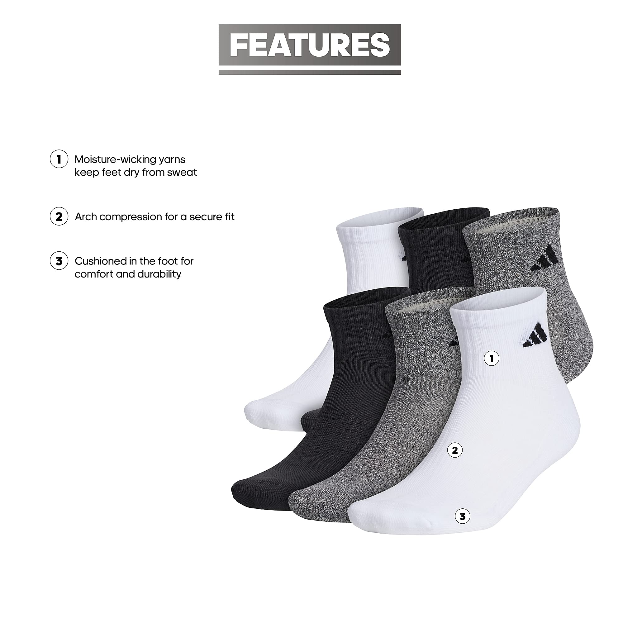 Description Quality, comfort, and durability is what you are looking for in your everyday sock and the adidas 6-pack delivers on all of your needs. now, with the addition of arch compression, this sock delivers a secure fit and gives you the best sock to handle your day to day.