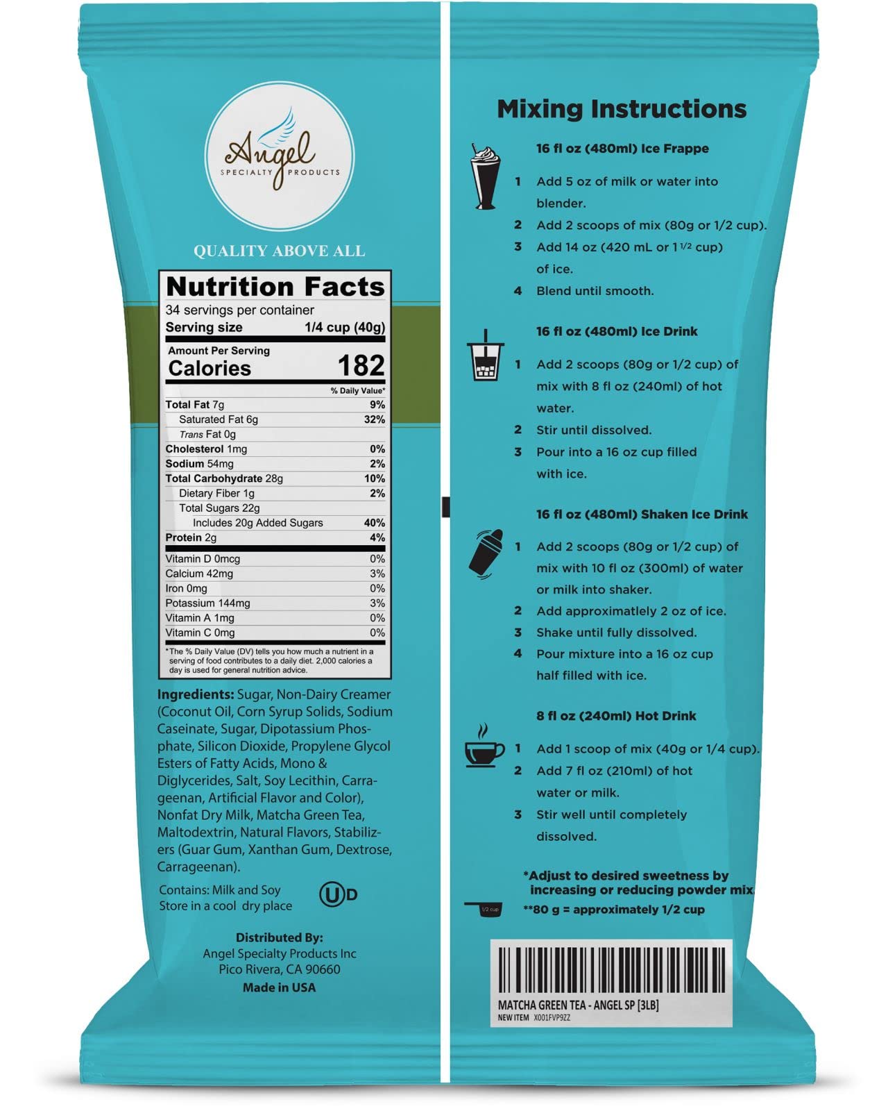QUICK & EASY: Make perfect Matcha drinks everytime! Just add water or milk. Serve hot, iced, or as a blended frappe! Angel 3-in-1 instant beverage mixes & blends are ideal for use in home kitchens, office kitchens, cafés, coffeeshops, boba/bubble tea shops & restaurants. Easy to mix & serve, Angel mixes, blended frappes, & smoothie bases make beverage blending simple.