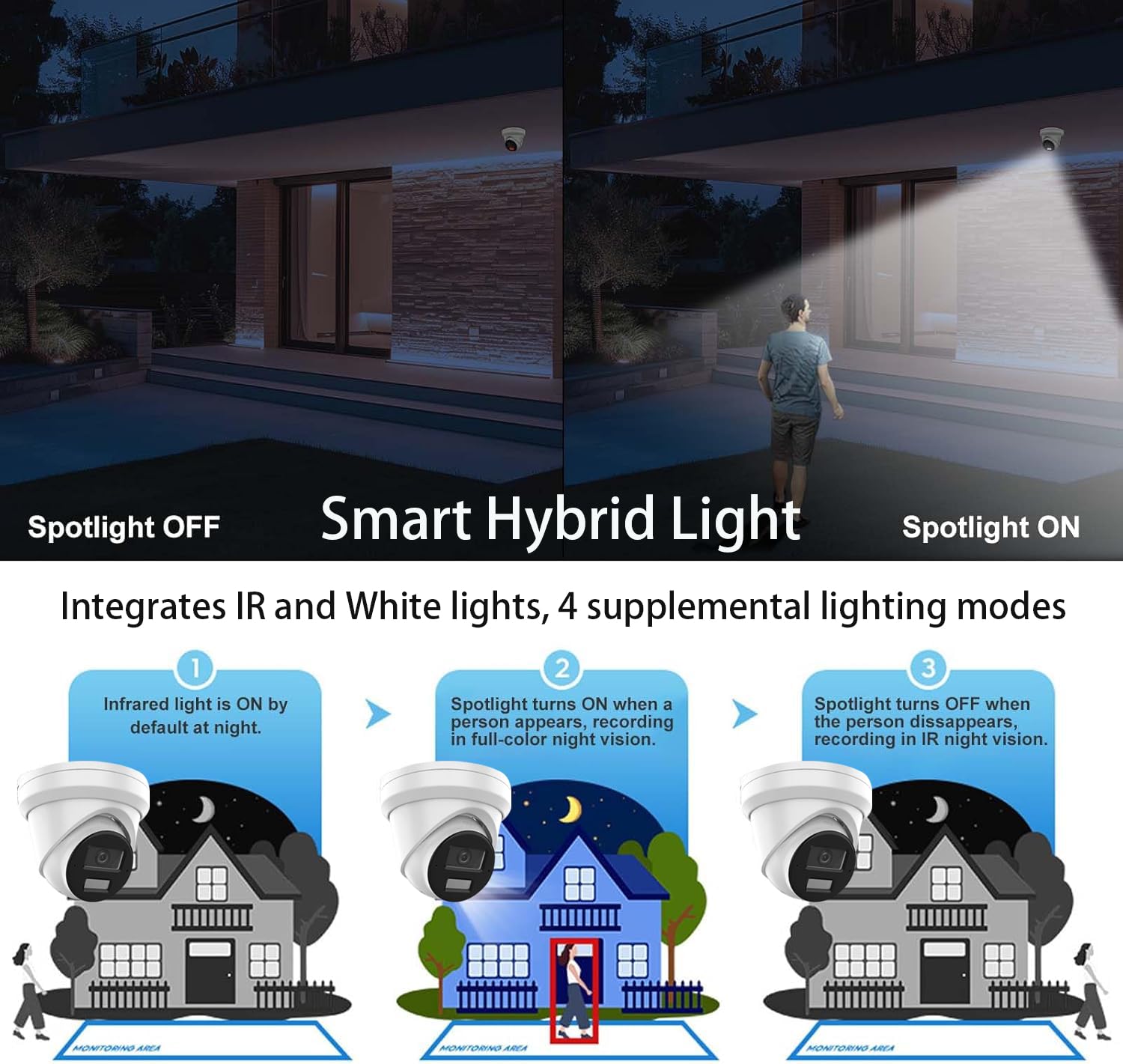 Night Vision & Smart Lighting: The Smart Hybrid Light technology seamlessly blends IR and white lights, offering four modes to provide optimal full-color or B&W video 24/7, even in complete darkness.