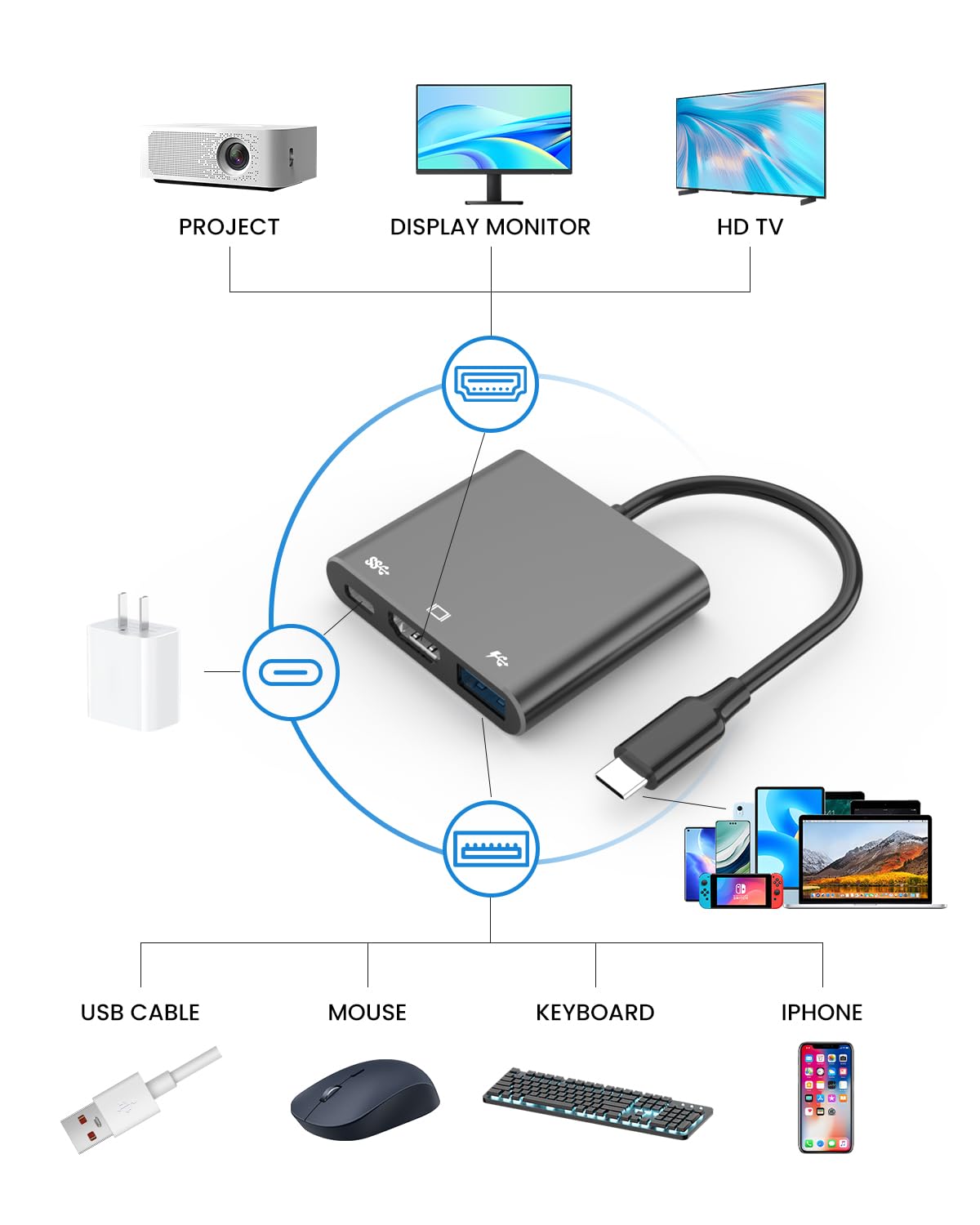 3-in-1 USB-C to HDTV Adapter: This USB-C to HDTV adapter is perfect for home entertainment, office work, presentations, and travel. Its compact, lightweight design makes it easy to carry and use wherever you go. You may need to change the "Default Audio Output Device" setting in System Preferences to get sound