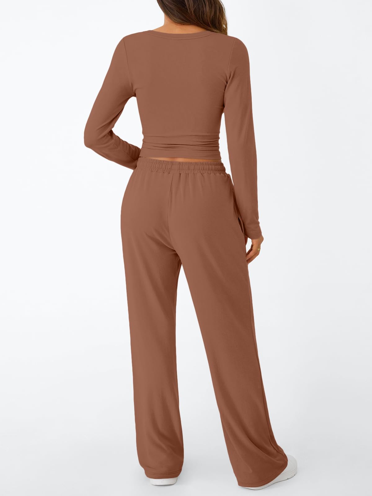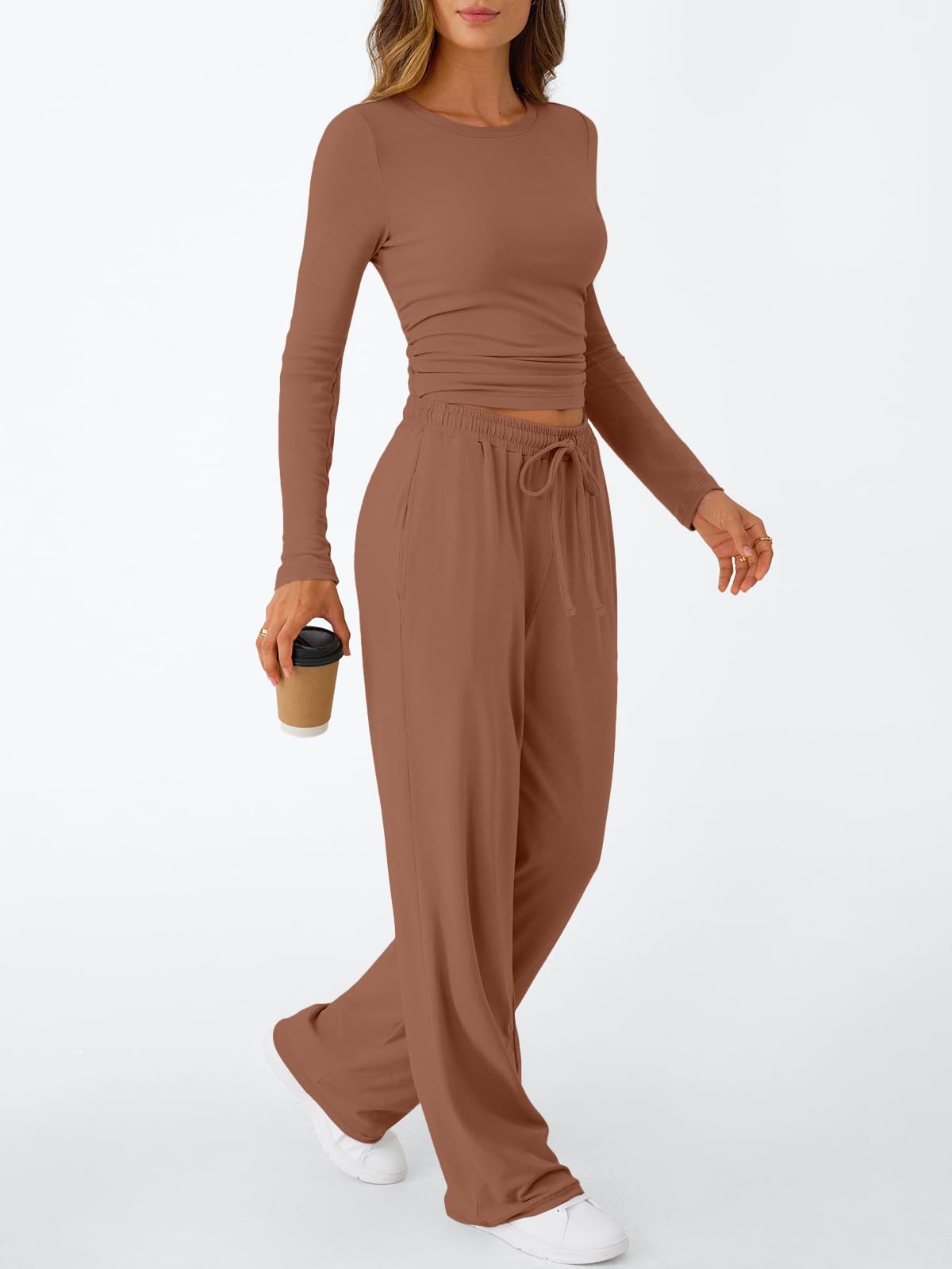 Design & Style: With a sleek crop top and wide-leg pants, this set is designed for those who love a mix of style and relaxation. The side ruching adds a touch of elegance, while the drawstring waist on the pants guarantees a comfortable fit that moves with you.