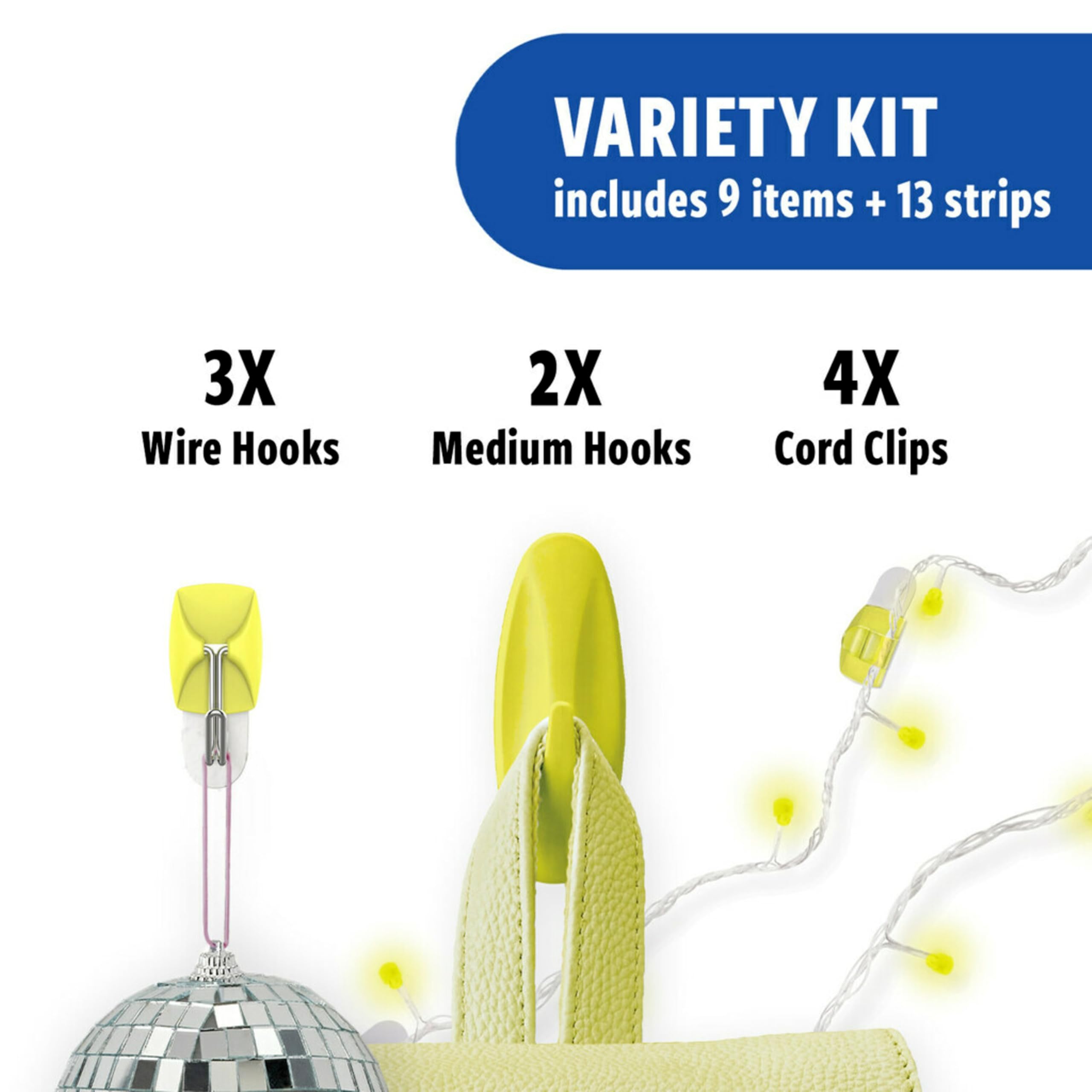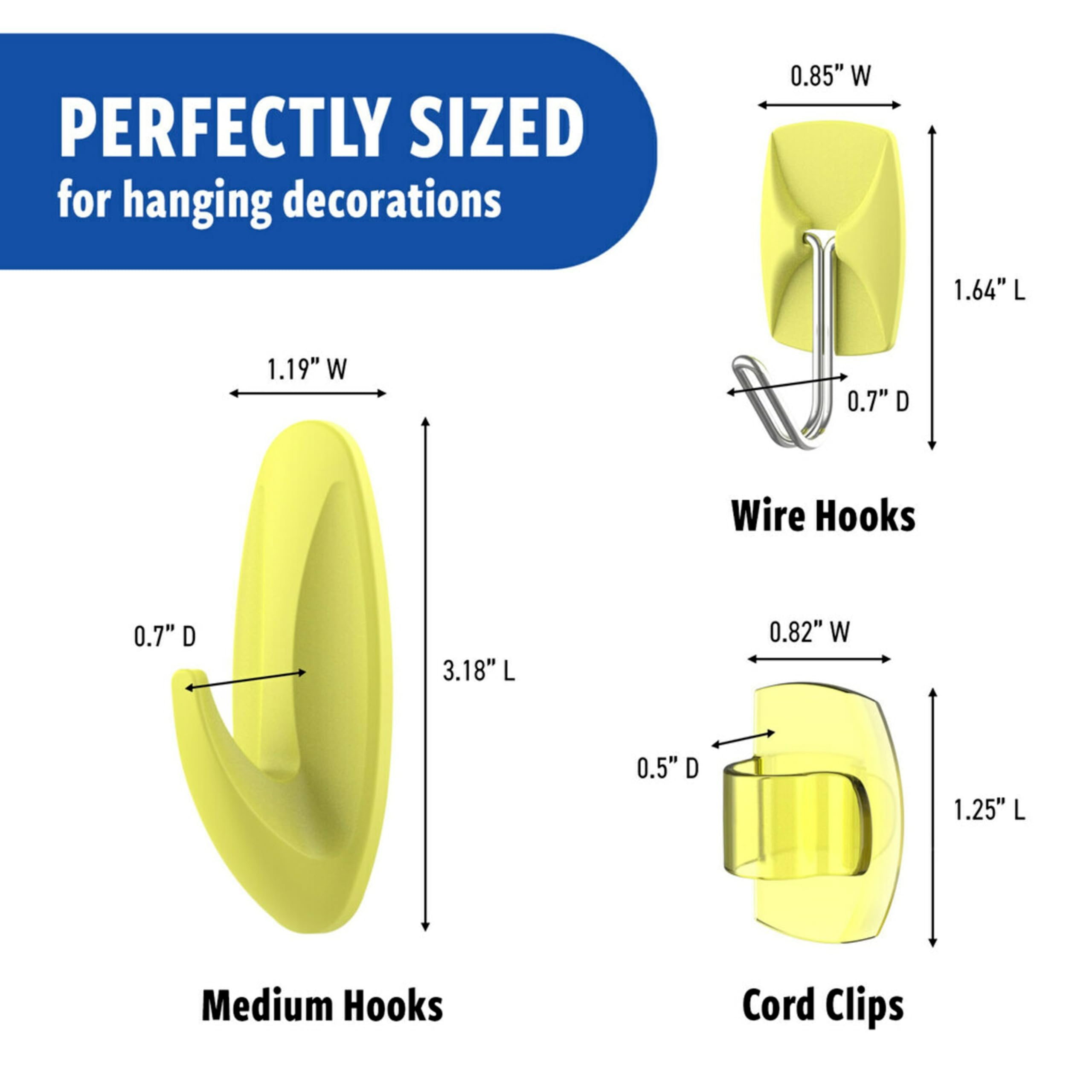 LIMITED EDITION PACK: Featuring our bright Citron color, this Limited Edition pack includes 2 medium designer hooks, 4 medium indoor strips, 3 small wire hooks, 4 small indoor strips, 4 clear round cord clips, and 5 small clear strips.