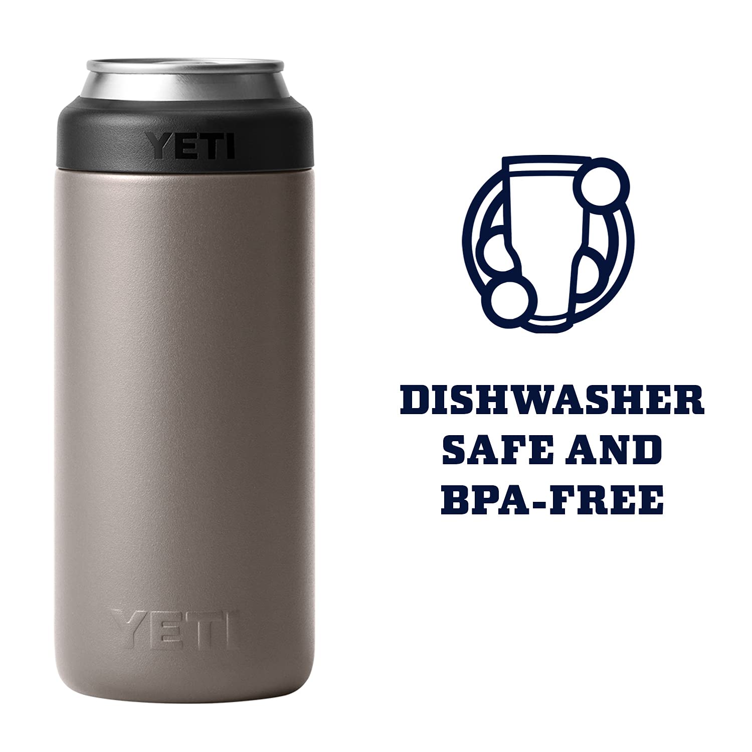 The YETI Slim Colster is dishwasher safe and measures: 2.25 in x 6 in