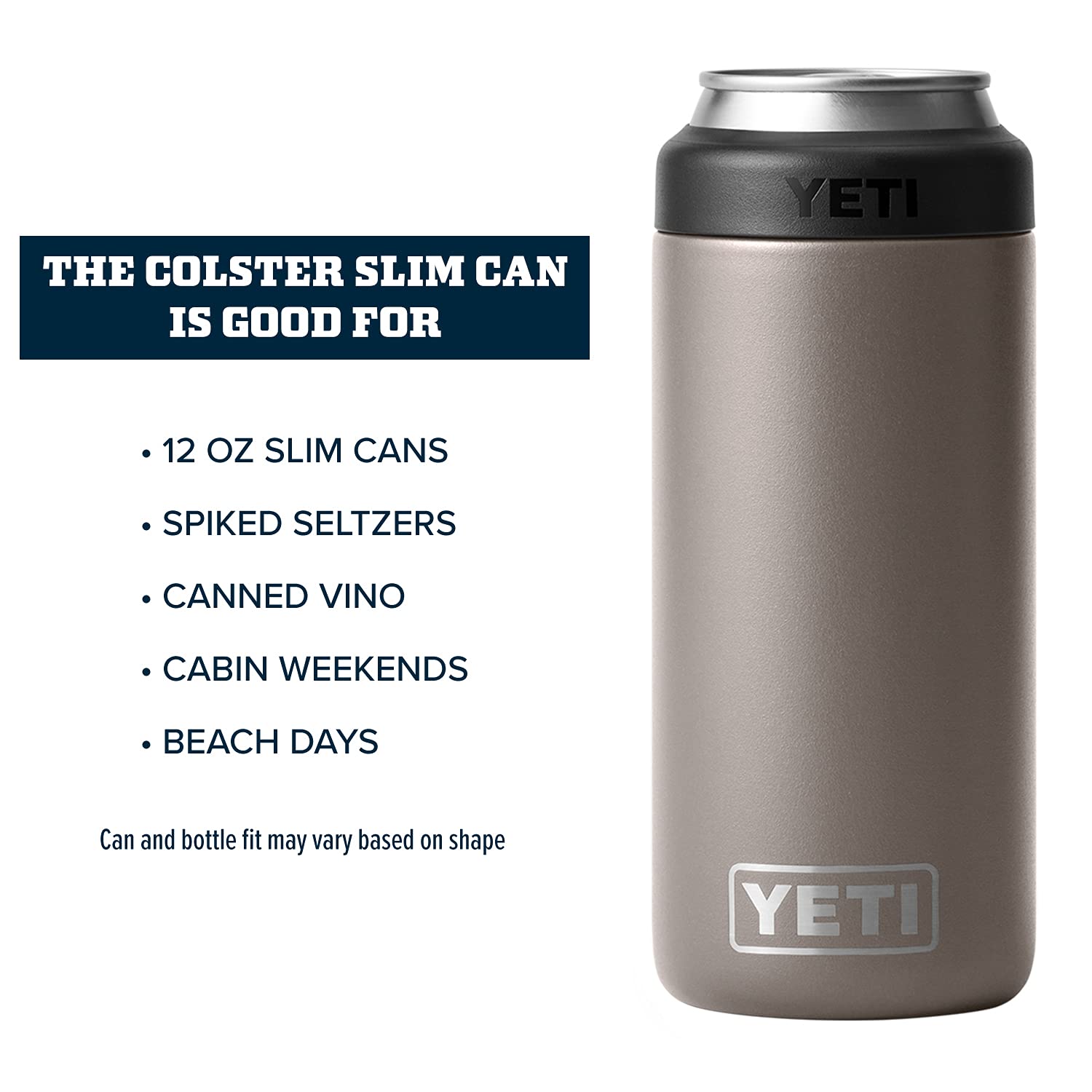 The YETI Slim Colster is good for: 12 oz Slim Cans, Spiked Seltzers, Canned Vino, Cabin Weekends and Beach Days. Can and bottle fit may vary based on shape