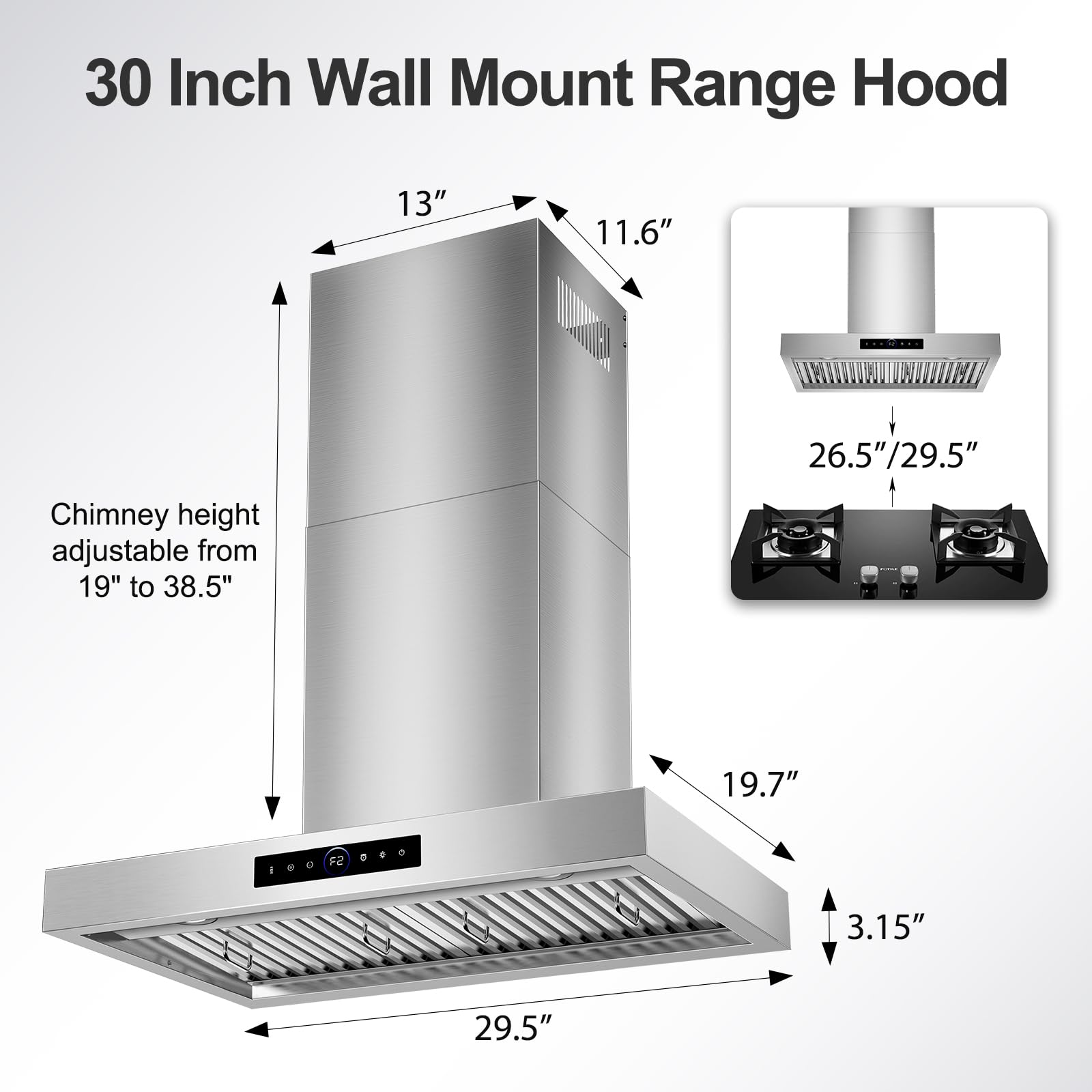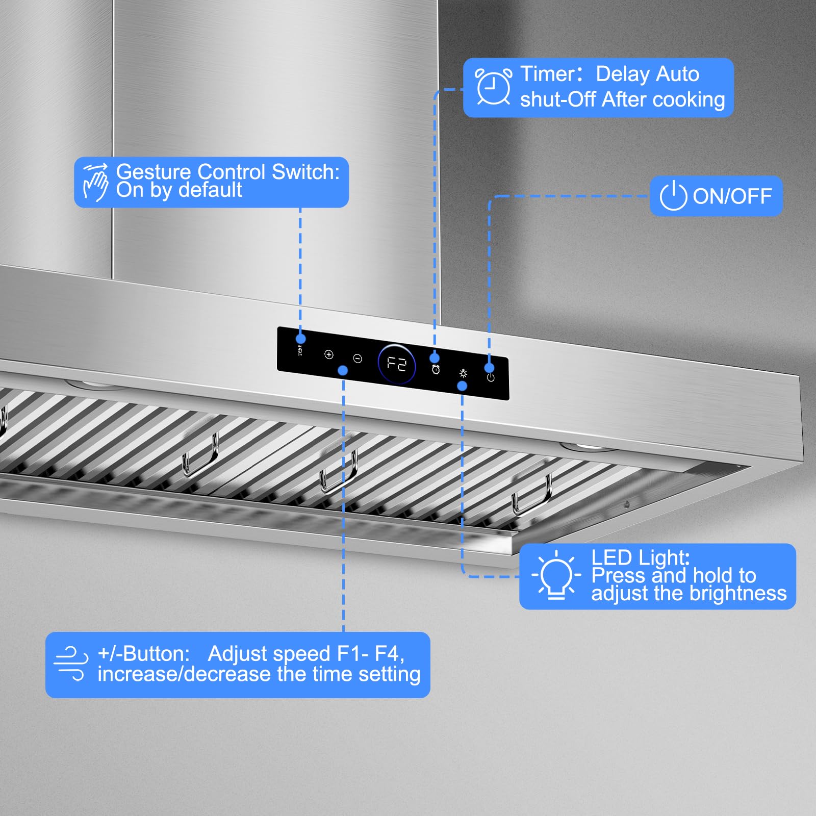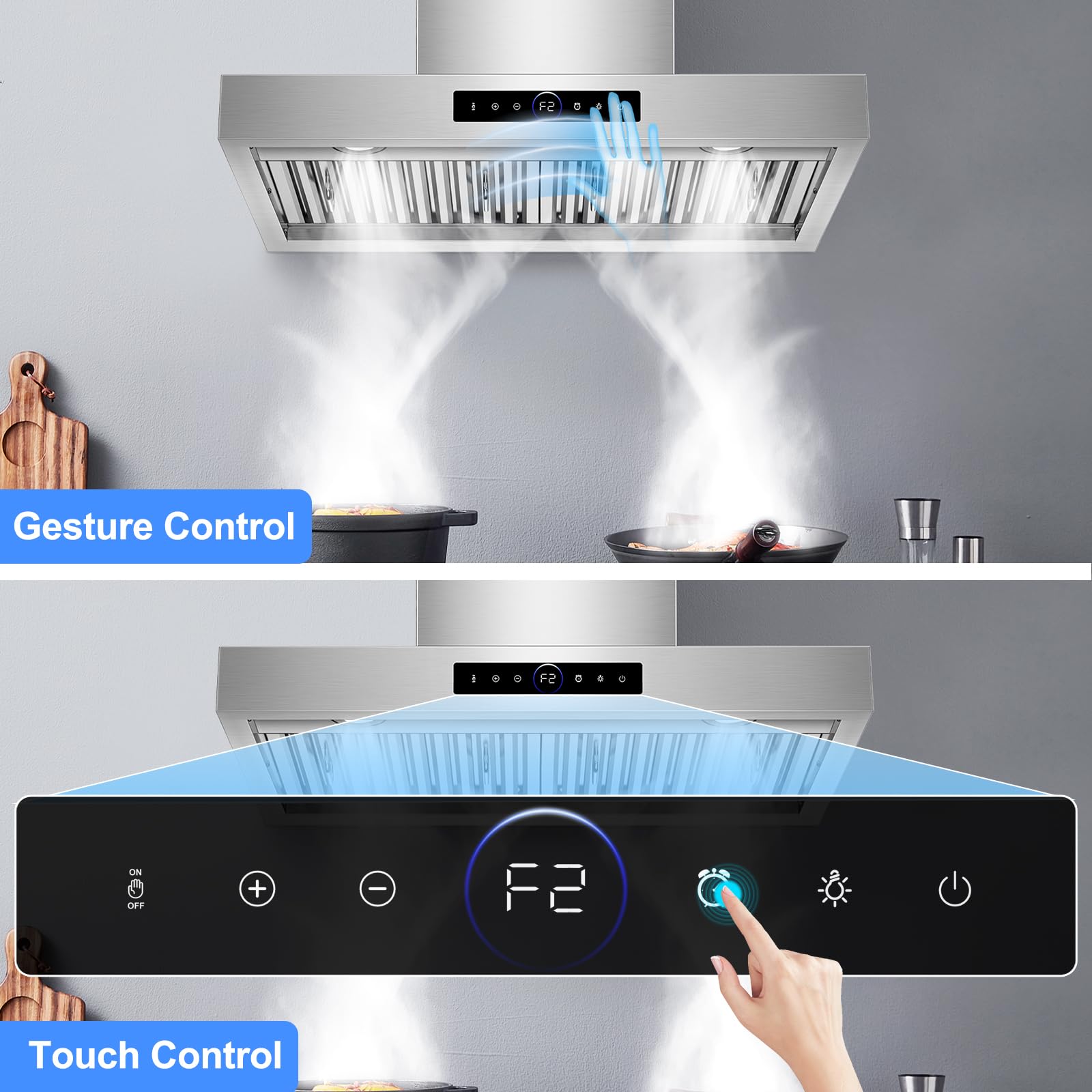 Touch & Gesture Control. This stylish and durable stainless steel wall mount range hood combines modern elegance with smart features. The intuitive digital touchscreen allows for quick adjustments, and advanced gesture sensing technology allows you to precisely adjust the wind speed with a wave of your hand, with smooth operation and effective avoidance of accidental touches. Easy control creates a cleaner and smarter cooking environment for you.