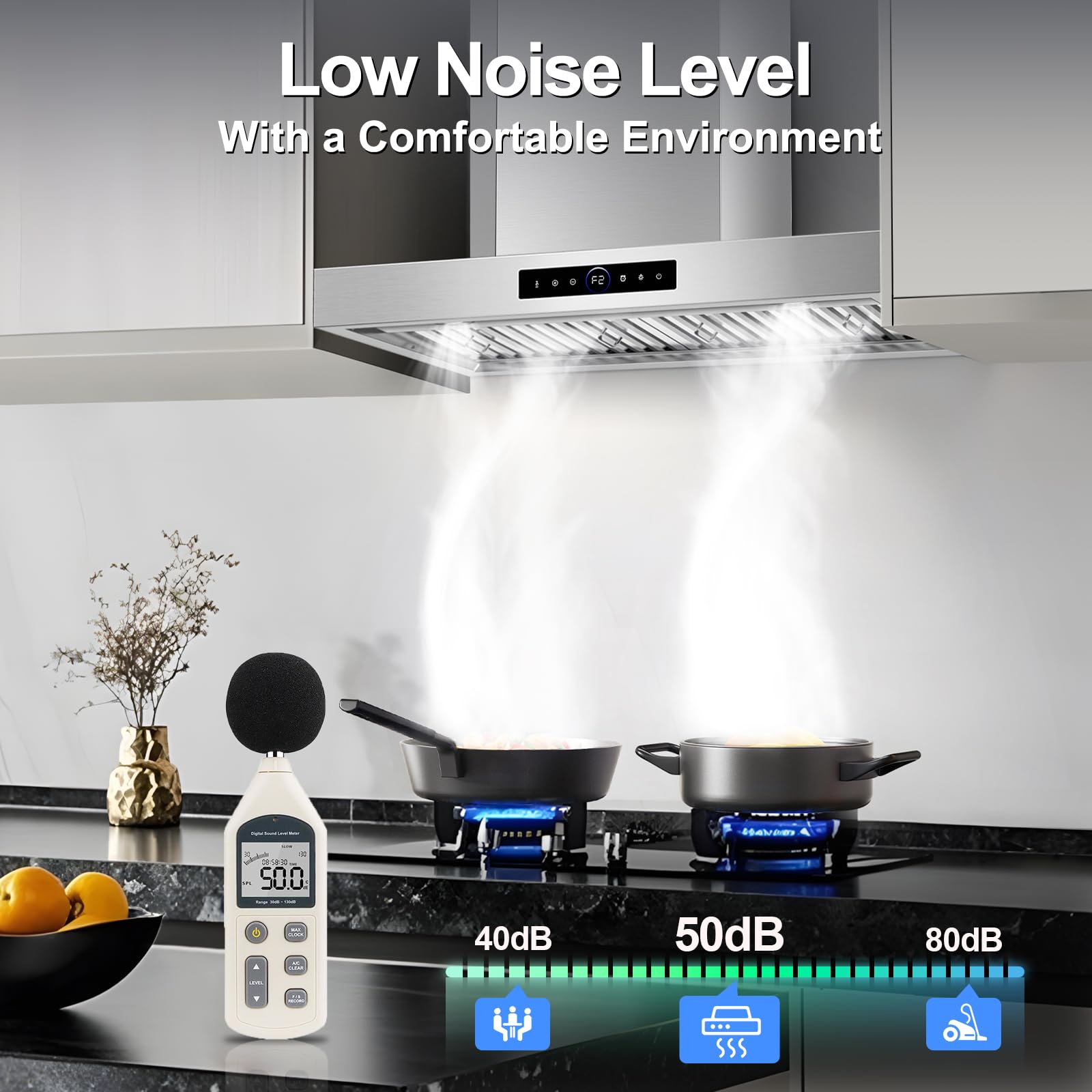 Ultra-quiet and Powerful Heavy-duty Range Hood. Unique dual duct system and dual motor design, powerful suction and low noise performance. At low speed, the noise is as low as 35 decibels, so quiet that even pets can take a nap; even at the highest setting, the noise is controlled below 50 decibels, which is quieter than a microwave oven, bringing a peaceful and pleasant cooking experience.