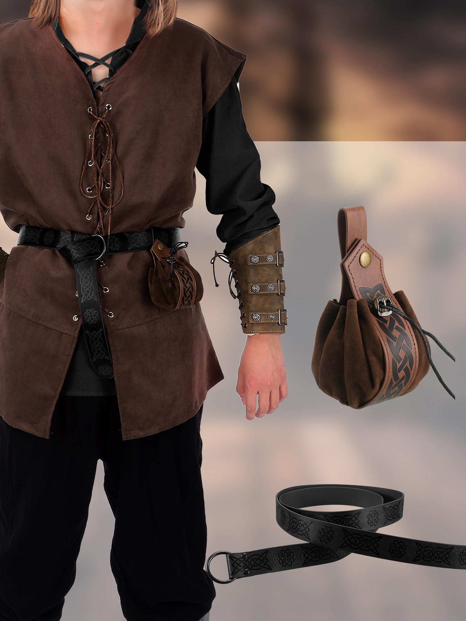 Rich Matching: 6 pcs medieval renaissance costume men includes knight cotton linen sleeve shirt, renaissance pants, medieval pirate waistcoat, viking belt, Halloween faux leather arm guards, pouch, creating a medieval look, suitable for many styles, very suitable for a Halloween cosplay party