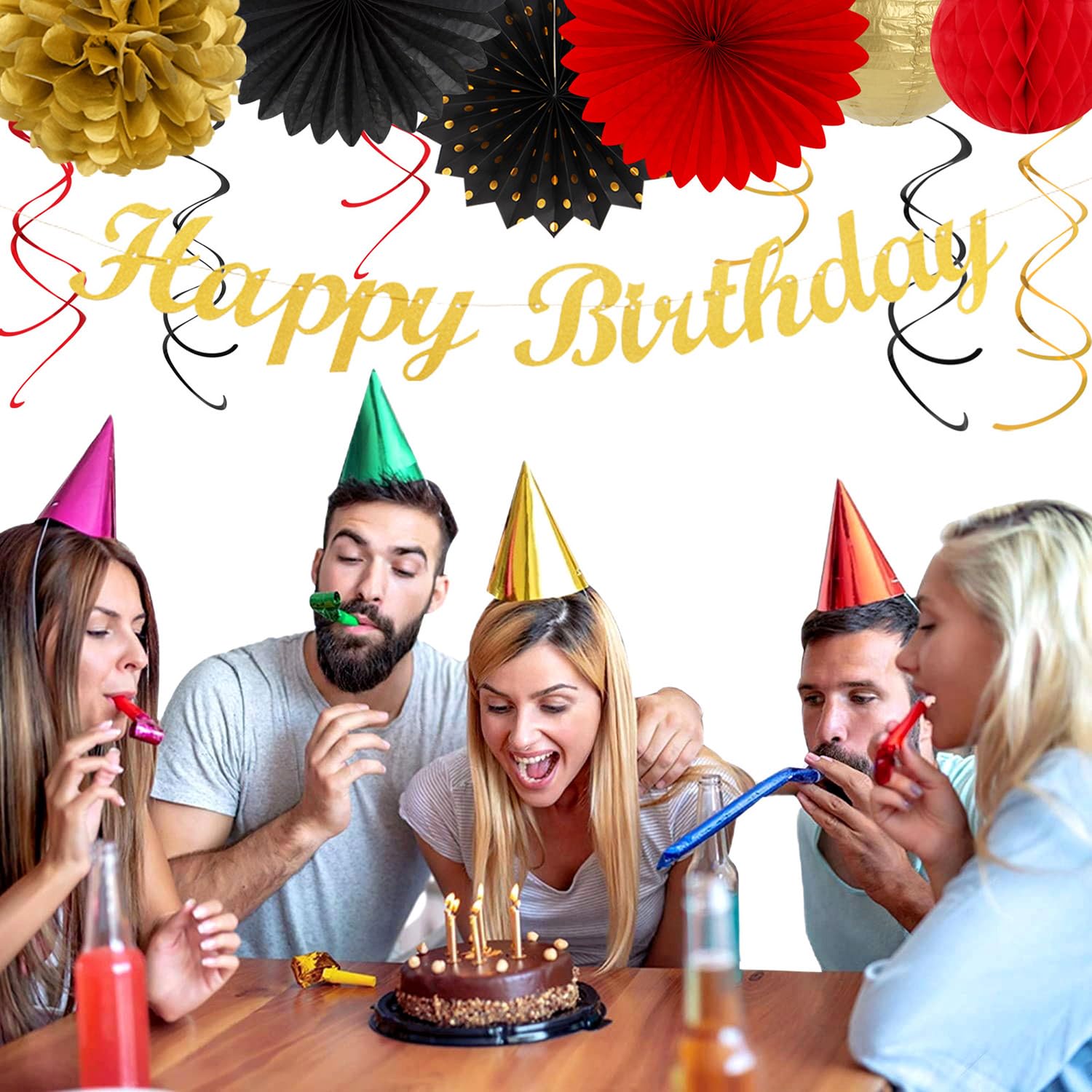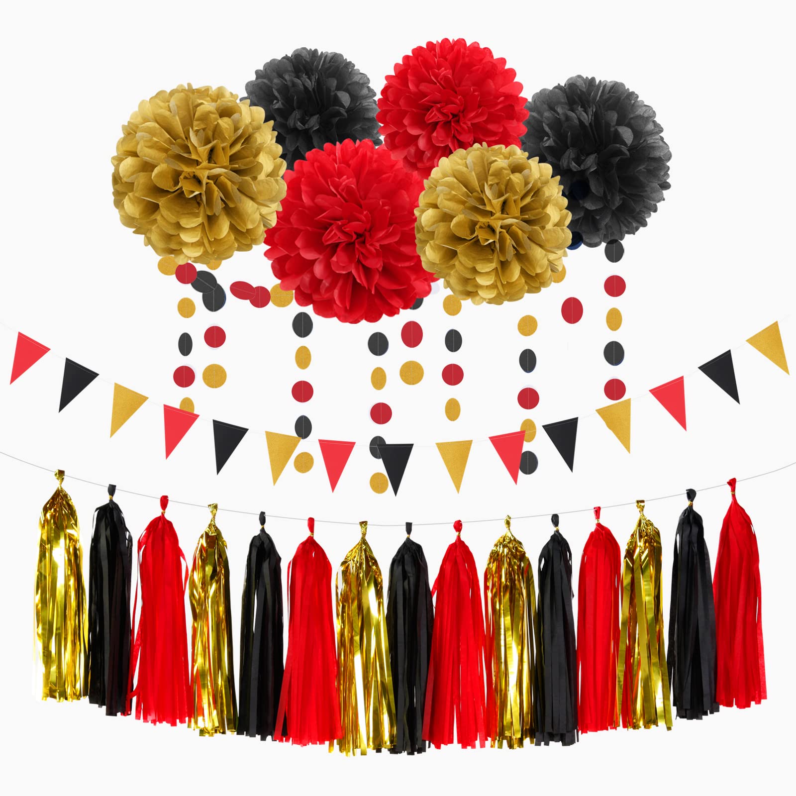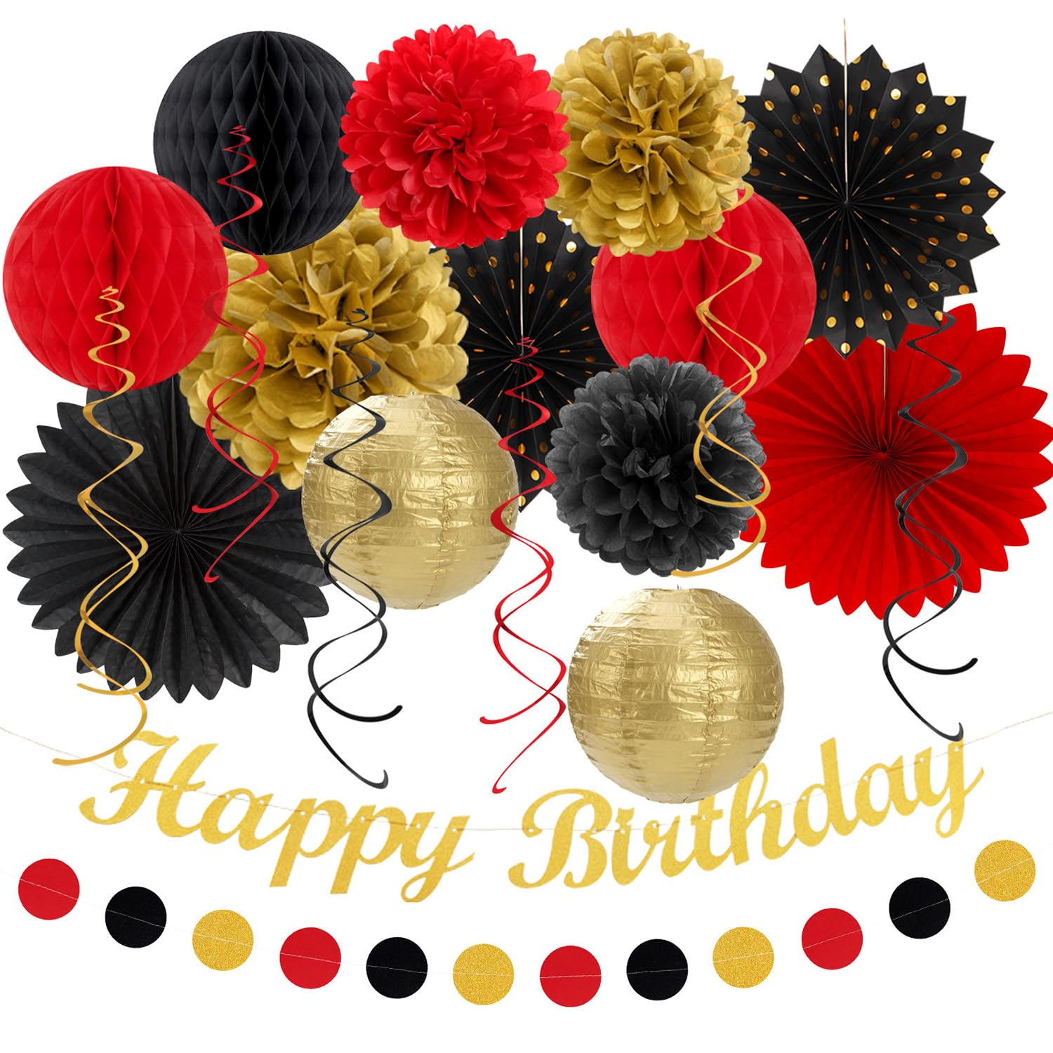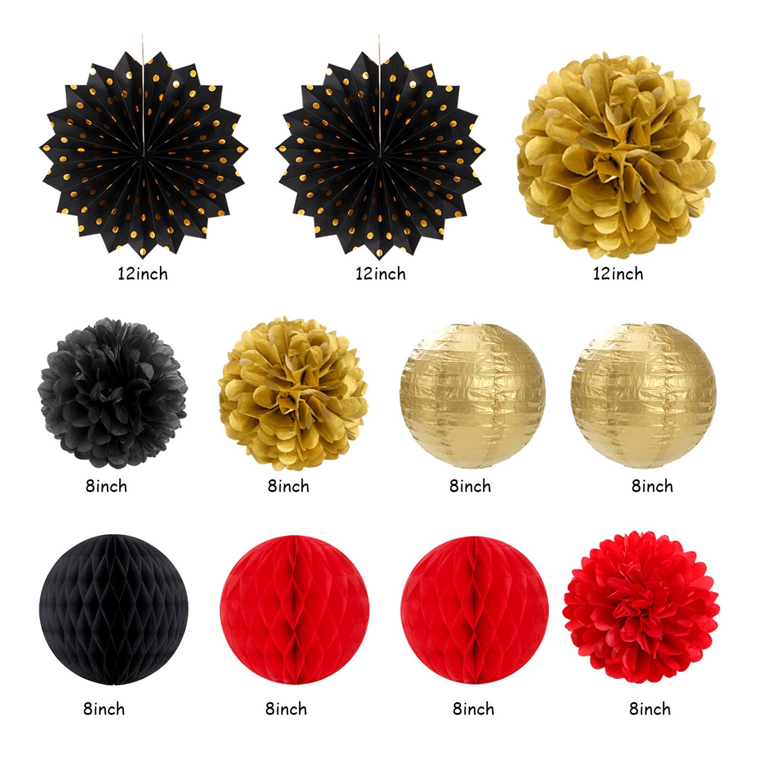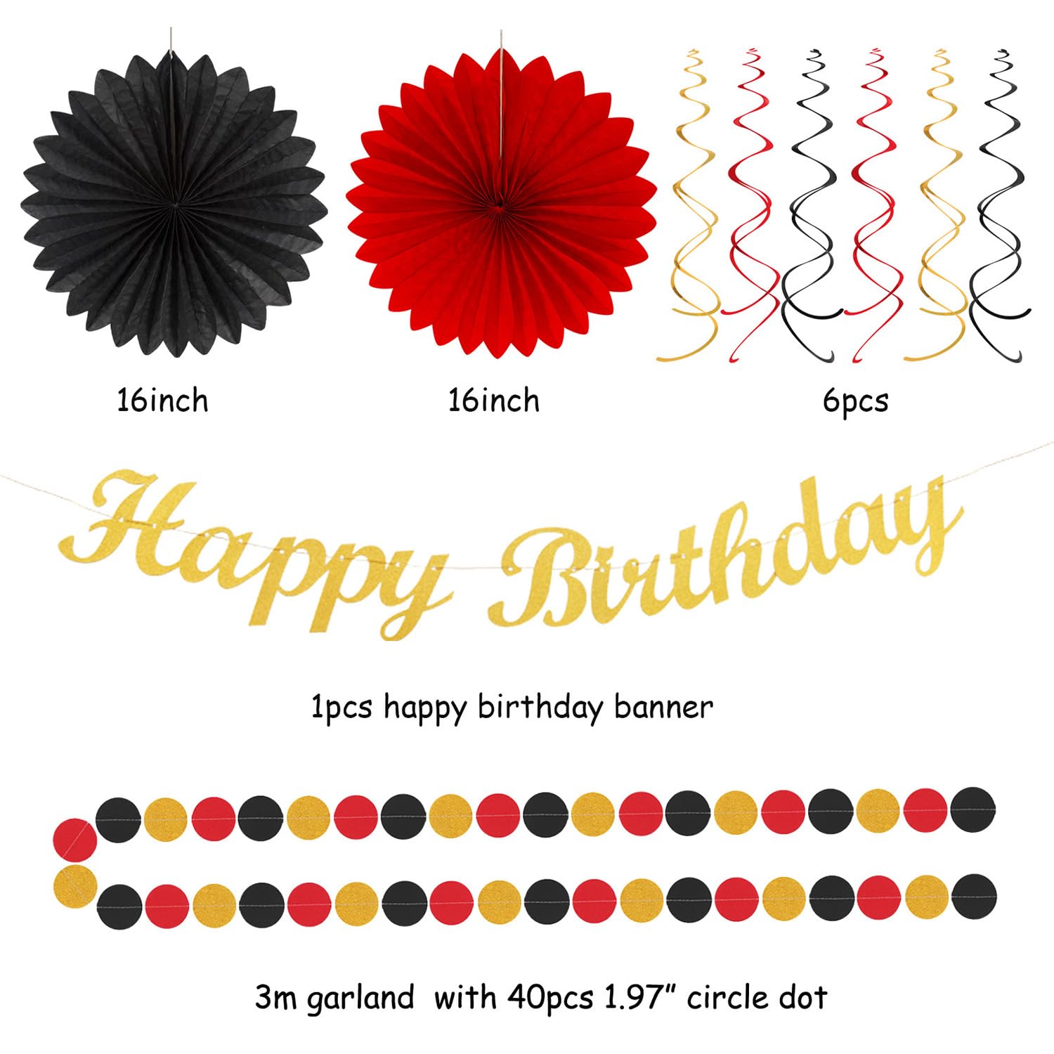 【Red Black Glod Party Kits】This kits include: 1pcs happy birthday banner,1pcs circle dots paper banner, 4pcs tissue pom poms: 3pcs 10" and 1pcs 12" in three color, 3pcs 8inch paper honeycom ball, 2pcs 8inch paper lantern, 4pcs 12inch paper fan, 6pcs Paper ribbon in two color(more packing details show in the package picture).