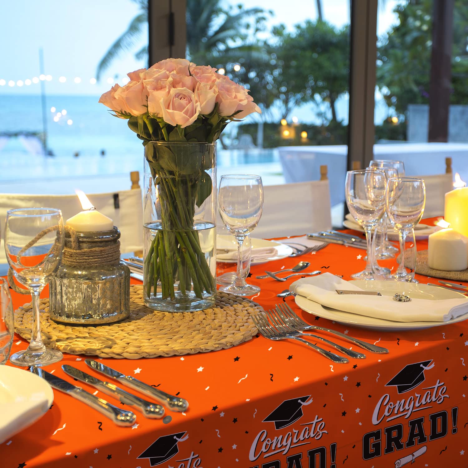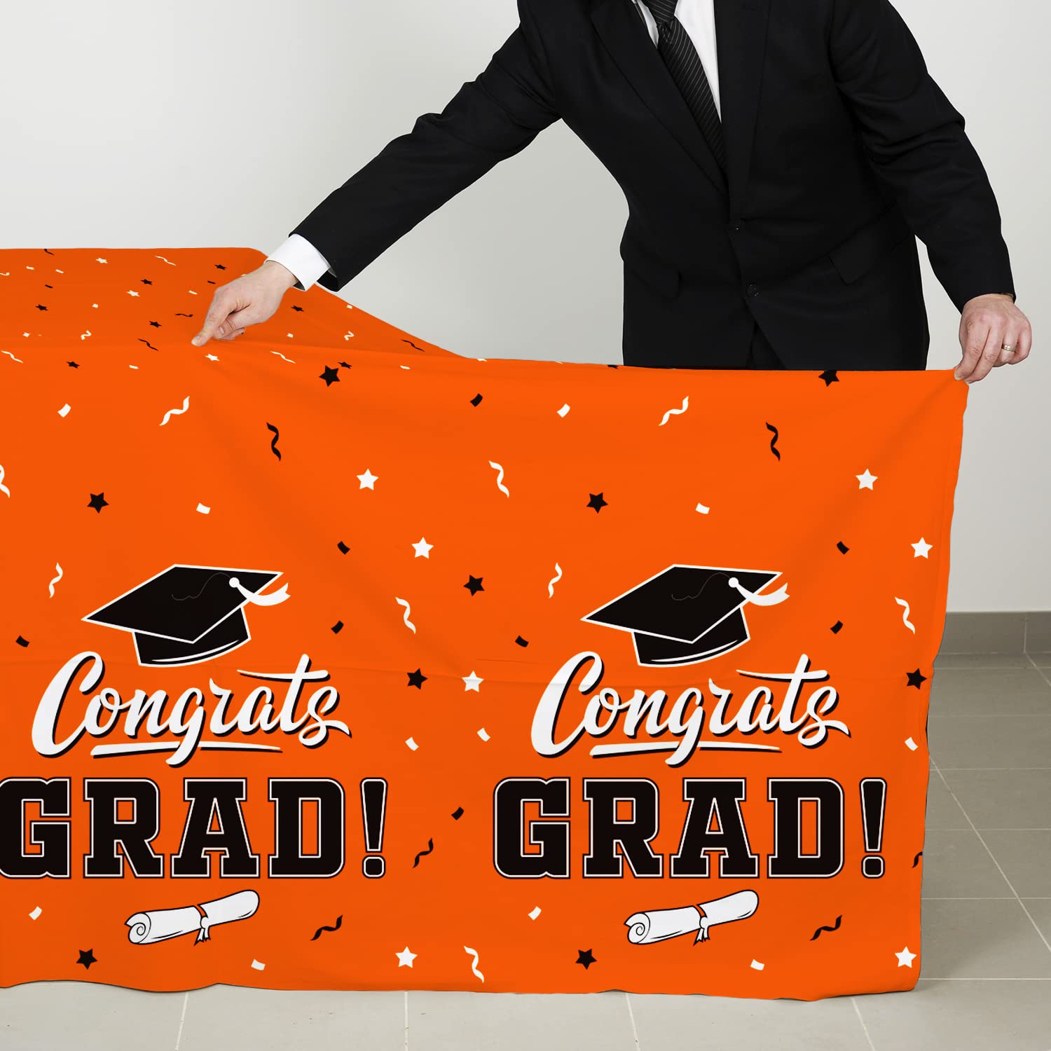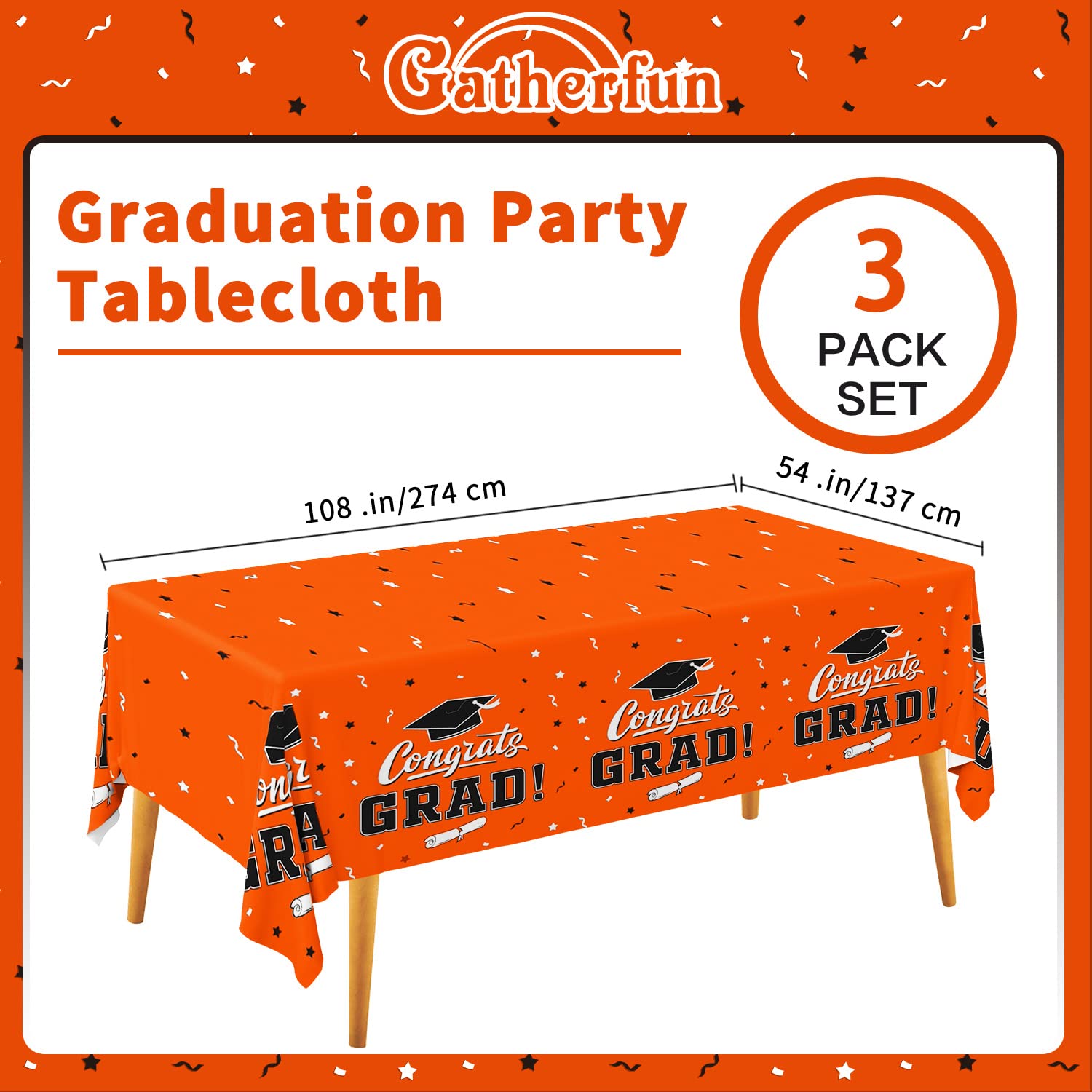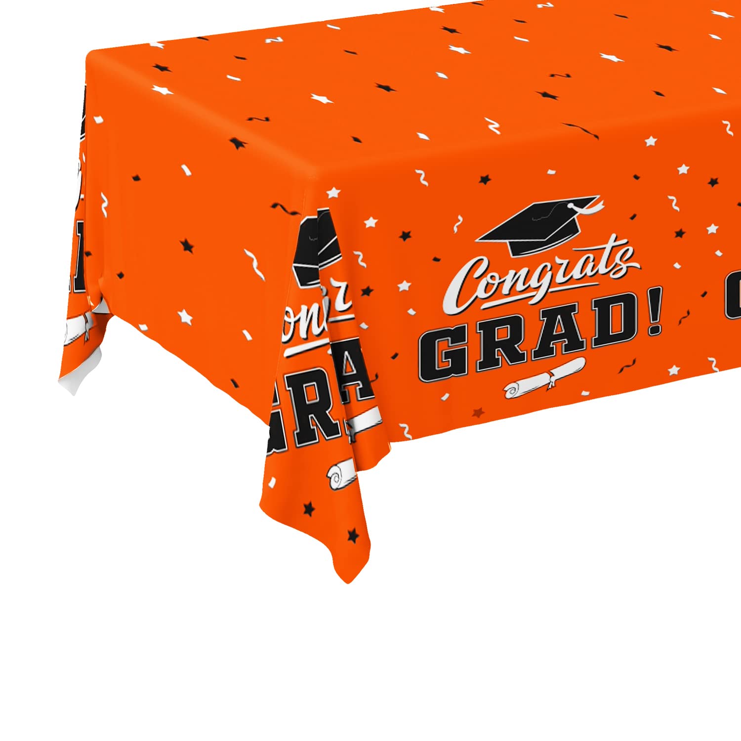 Orange background, repeating pattern of mortarboards and "CONGRATS GRAD" , this graduation party tablecover reflect a sense of belonging of school spirit.