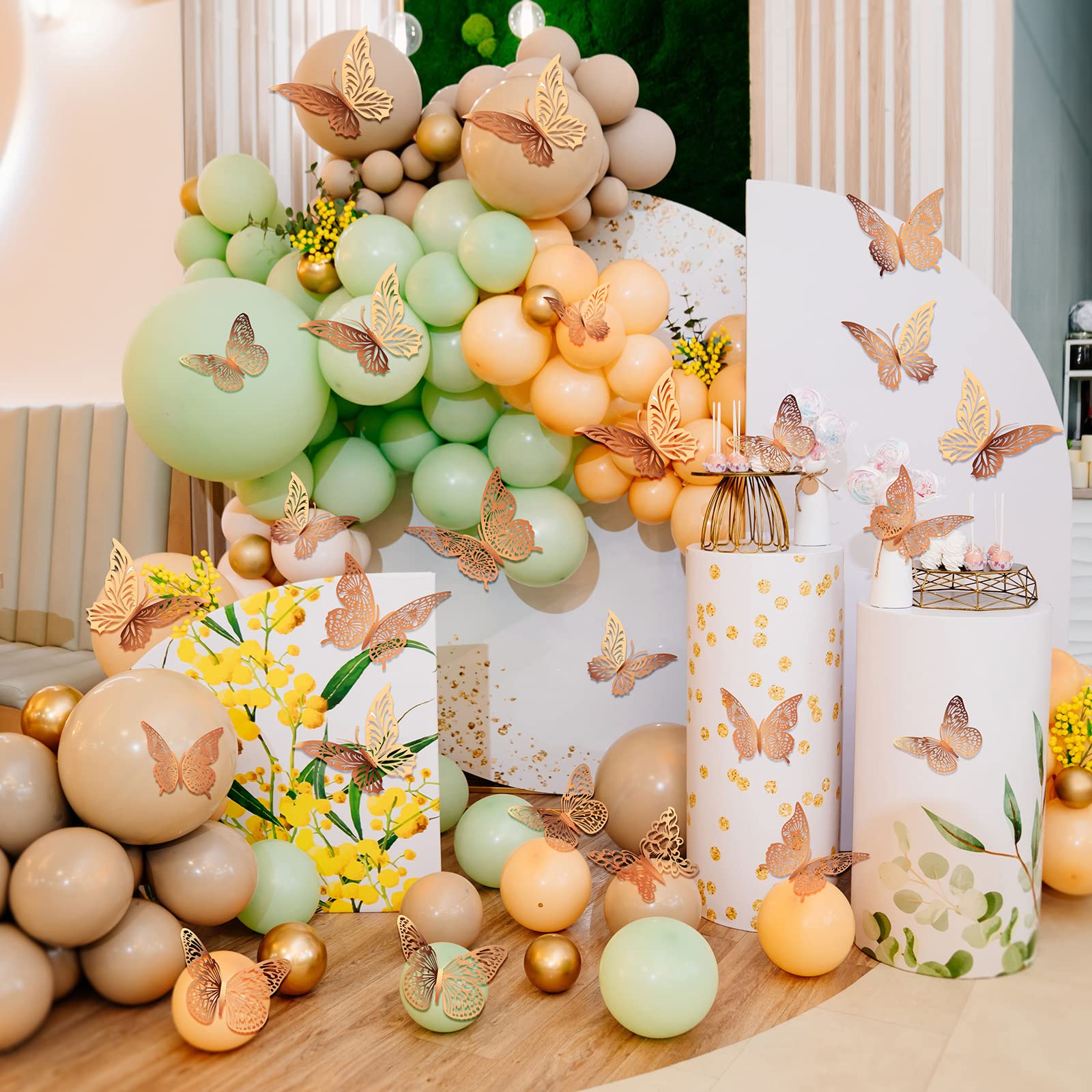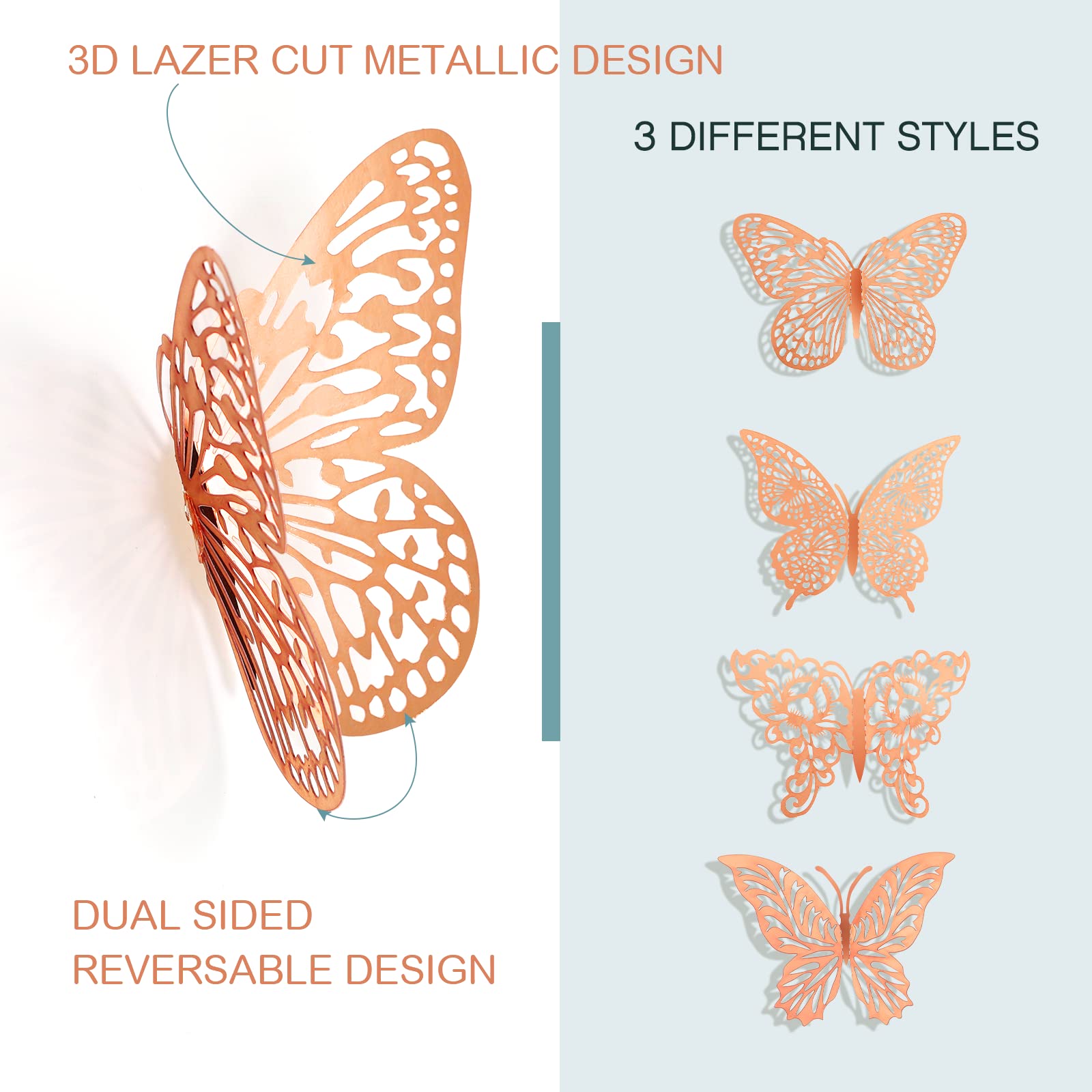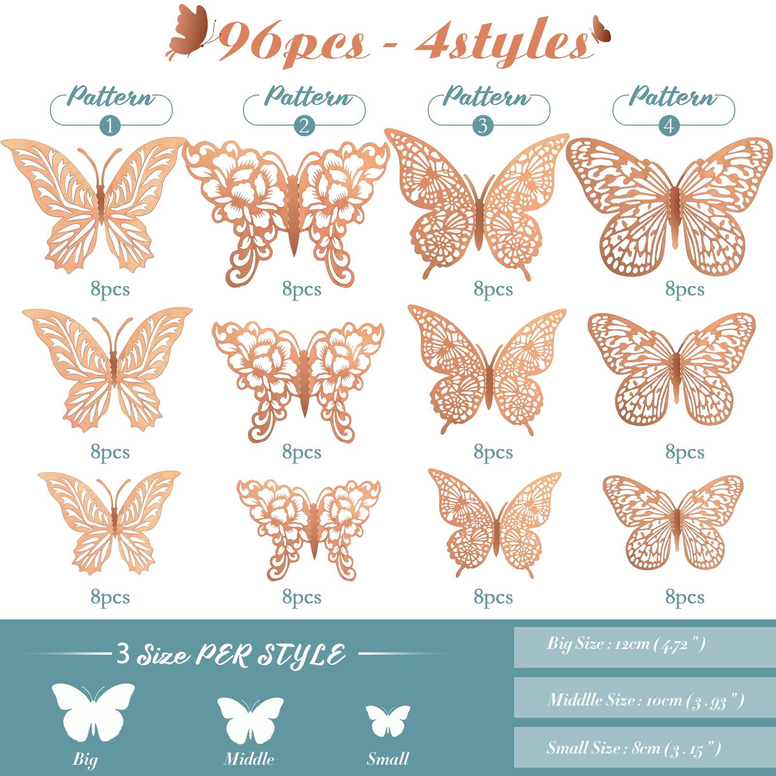 What You Get - 48pcs new design metallic butterfly decors in 4 styles. Each style has 3 sizes in 12cm (4.72) of large, 10cm (3.93”) of medium and 8cm (3.15”) of small, and every size have 4 pieces. The package also contains 48 pieces of removable double-sided adhesive.