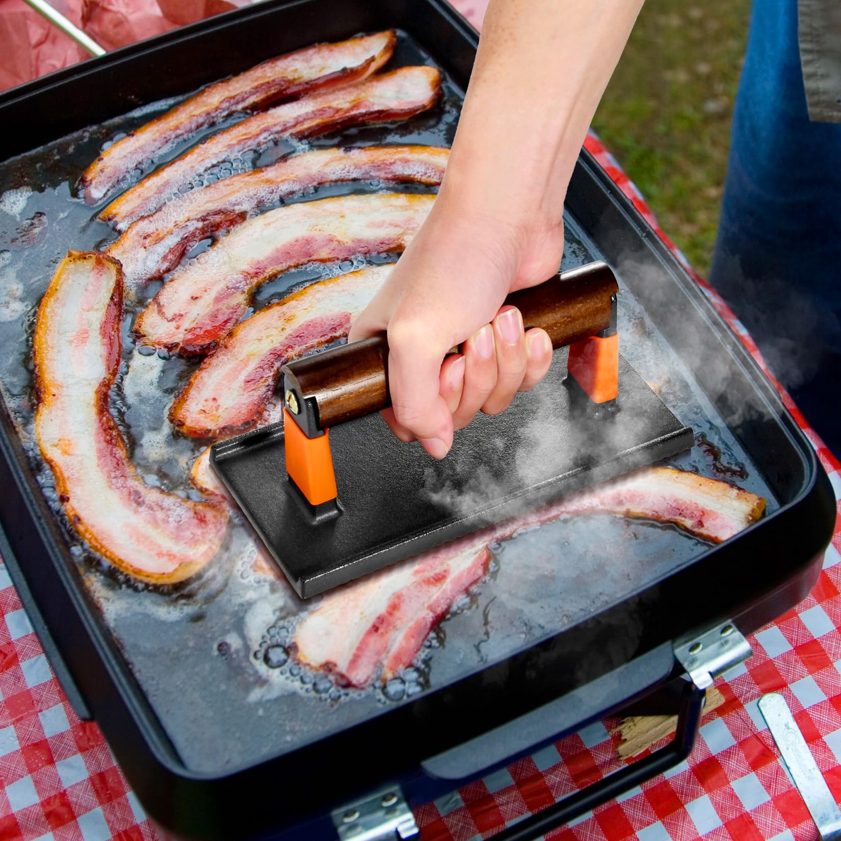 【Superior Quality】: GGC bacon press made of food-grade matte cast iron, durable and sturdy, not easily deformed. The cast iron burger press is easier to restore the original flavor of food. Perfect for patties, sandwiches, bacon, veggies, eggs on the grill and griddle