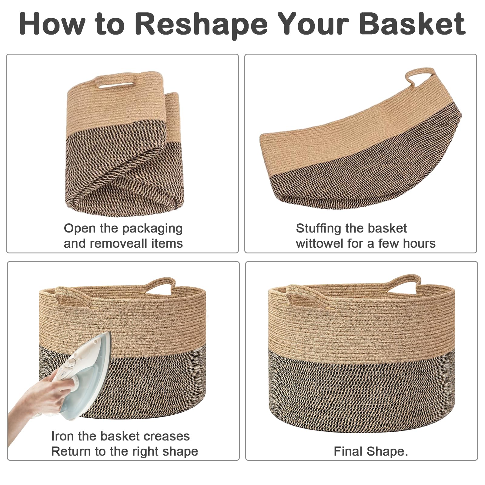 【Convenient Use】 Storage baskets comes as folded,will have crease.Fully fill the cotton rope basket with towels or clothes waiting for 2-3 days could reshape it..Steaming or Ironing could reshape the decorative storage bins as well