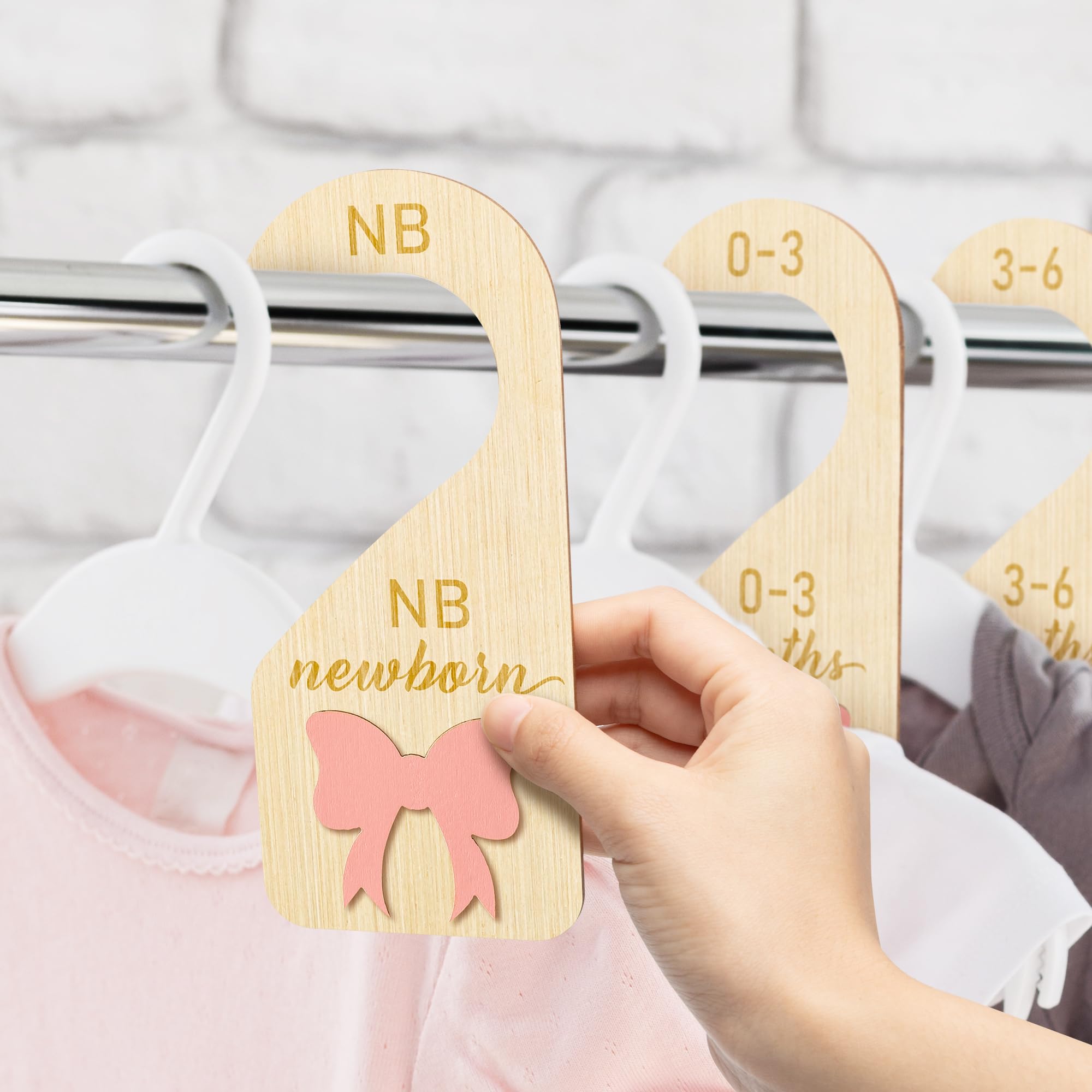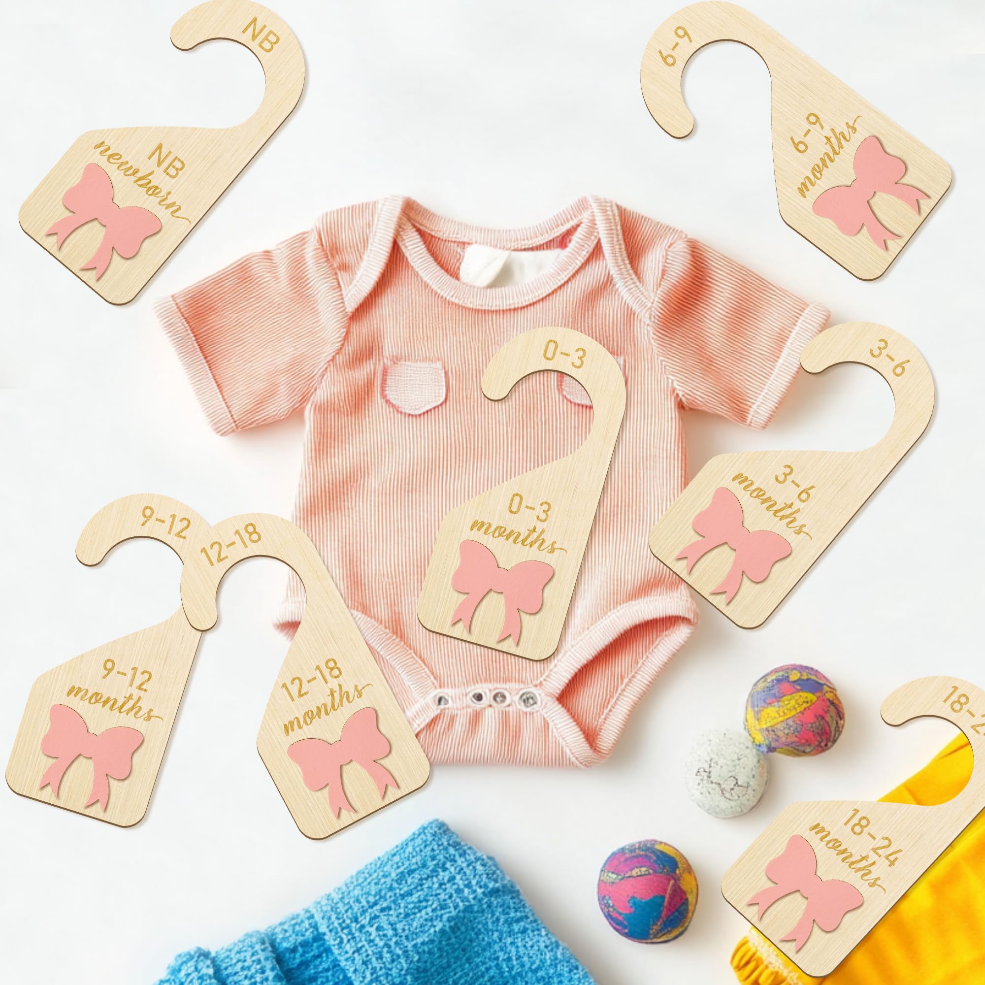 Pink Bow Baby Closet Dividers: Package includes 7Pcs clothing dividers covering all ages from newborn to toddler, Newborn, 0-3 months, 3-6 months, 6-9 months, 9-12 months, 12-18 months, 18-24 months, and 1 black velvet bag. Excellent choice for organizing clothes for parents-to-be.