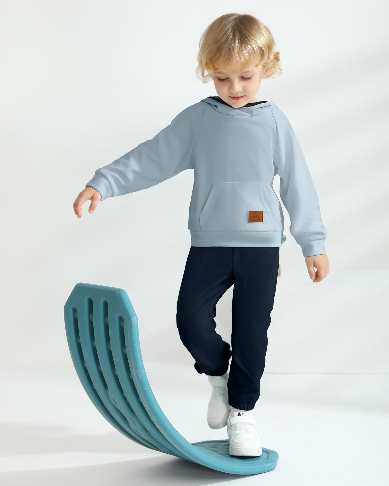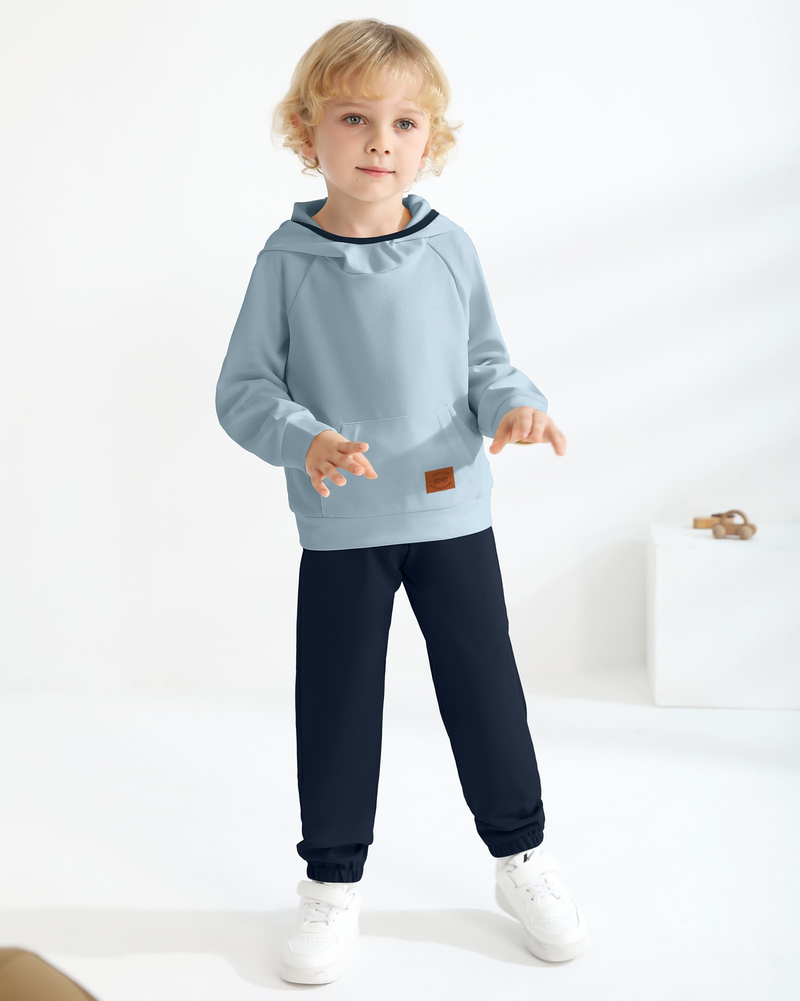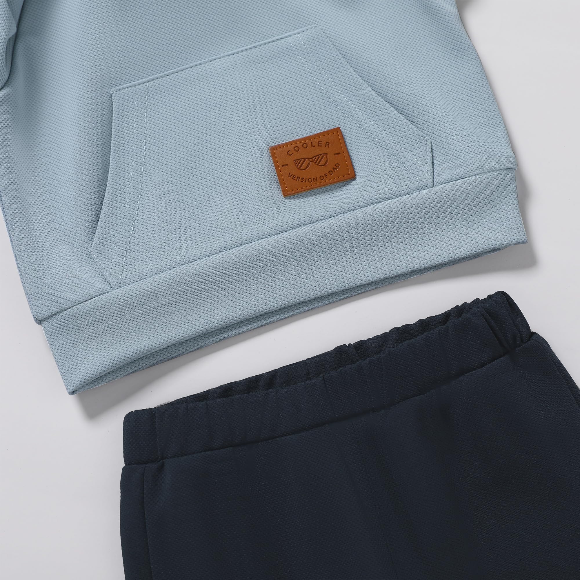 Design: 2-piece toddler boy clothes features an original design, soft solid color hoodie with pockets and matching pants, black circles on the hood and icons on the pockets will give your child a little more stylish