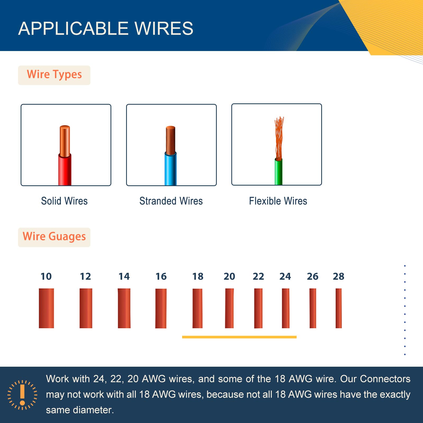 USE THE CORRECT WIRE - Fits well for 20, 22 and 24 AWG stranded and solid core electrical wires. As for 18 gauge wire, not all 18 AWG wires are with the exactly same diameter in the market. You may be able to use these wire splice connectors with 18 AWG wire.