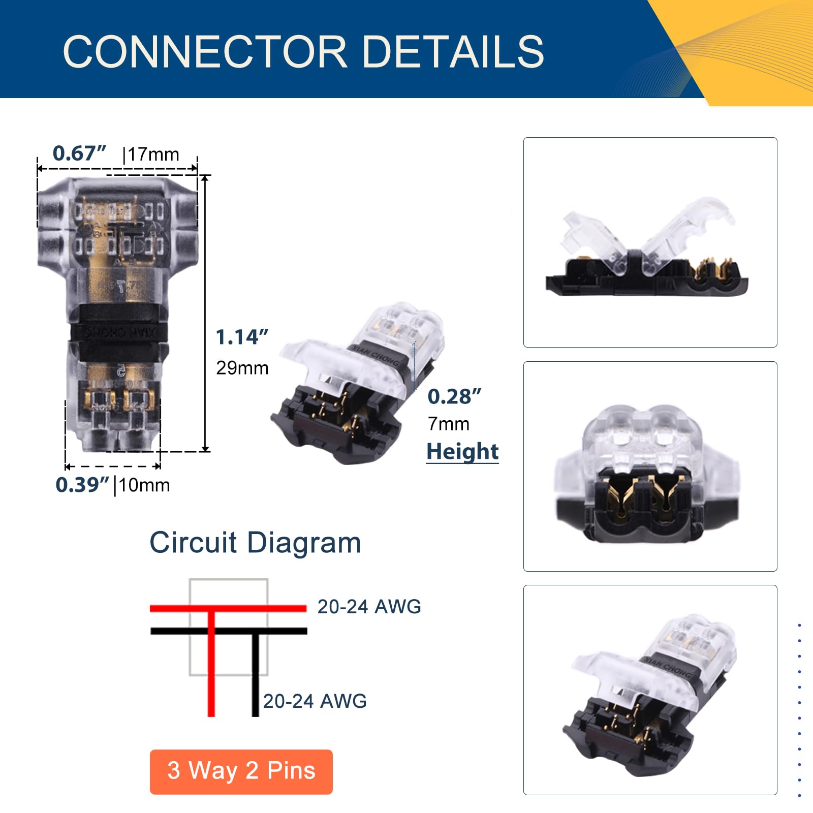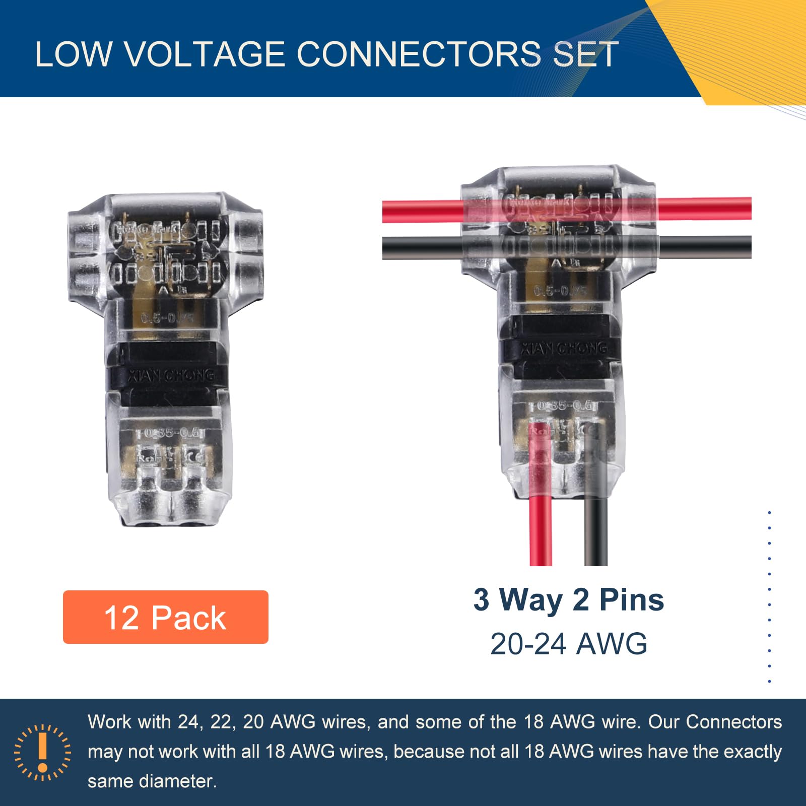 PACKAGE INCLUDES - 12 pack 3 Way Dual Pins low voltage wire connectors.
