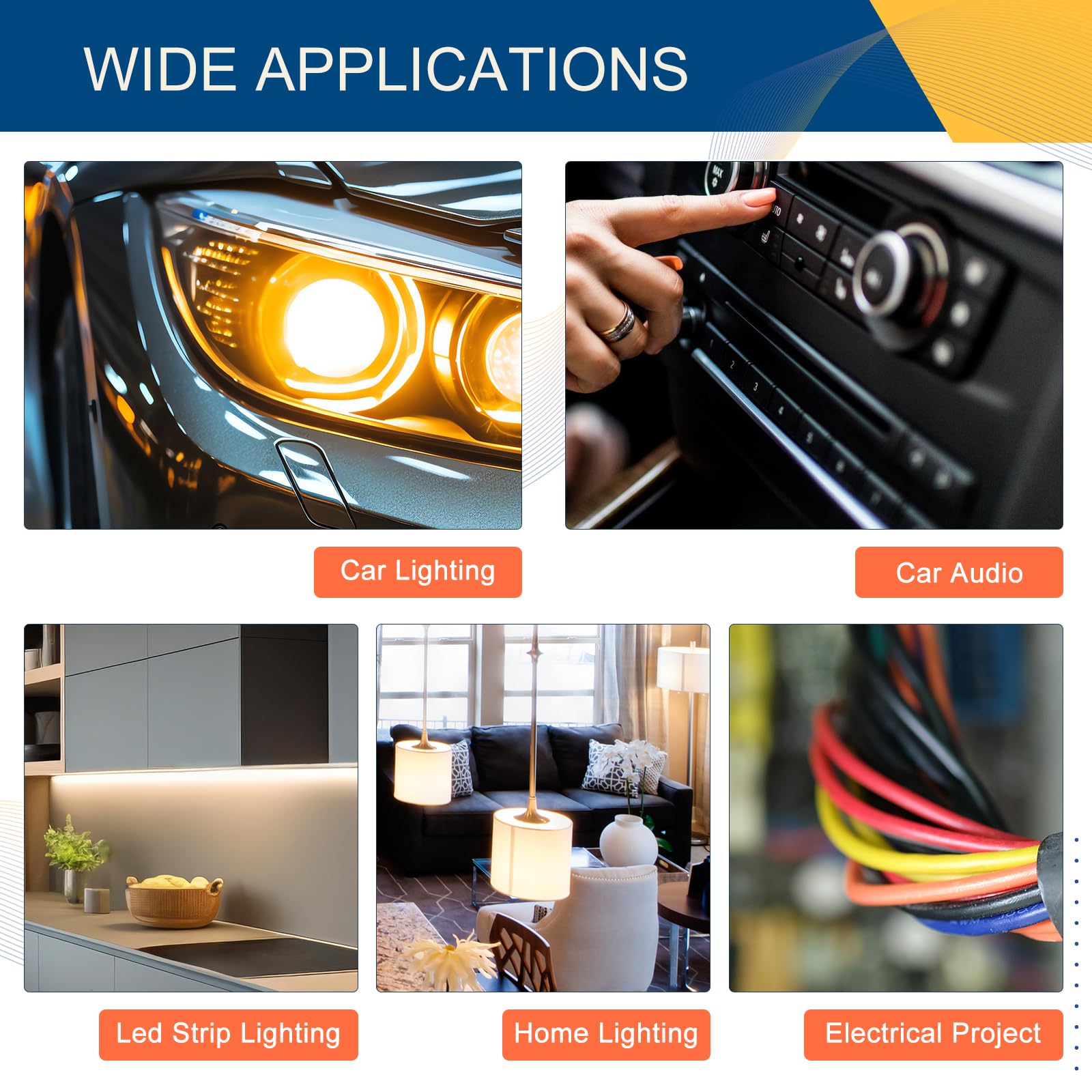 WIDE APPLICATIONS - Perfect for all vehicle/audio/video/LED light strips installation and other electrical wiring projects, like car audio, LED turn signal lights, car's cigarette lighter wiring, speaker wire splice, etc. Our t tap wire connectors can be widely used for various low voltage and high voltage electrical hookups. If you also need other shape connectors, please click into our store to find more connectors.