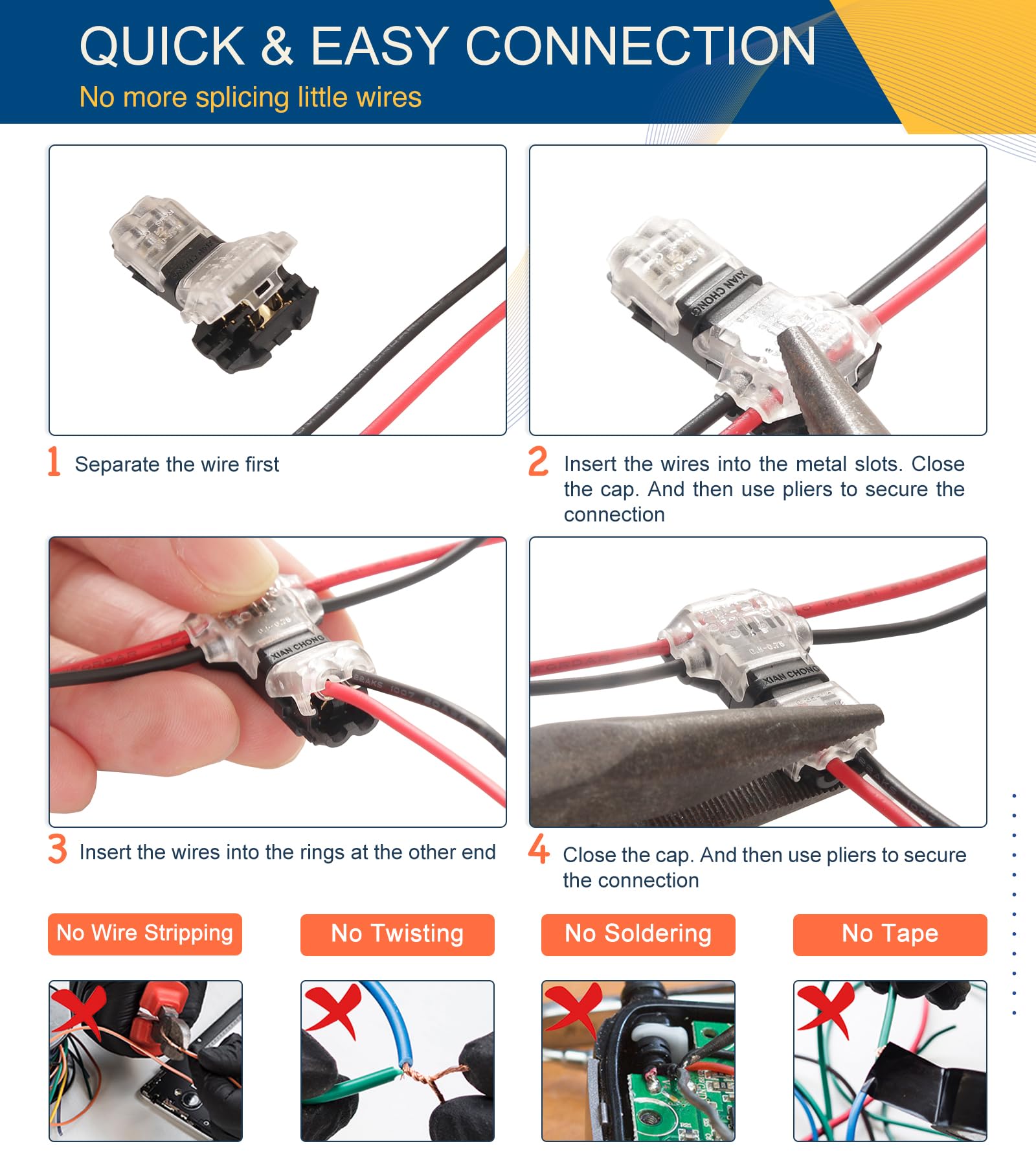 NO MORE SPLICING PESTY LITTLE WIRES - Wire taps have always been annoying. Our T tap wire connectors are absolutely inspiring. With innovative copper clasp connection design, our t tap wire connectors save you from Peeling or Stripping, Cutting, Soldering, even Welding wires like the βold schoolβ way. They take care of all the connections with ease and kept everything clean and easy to manage, provide a much simpler and quicker installation process. Cut the install time by half.