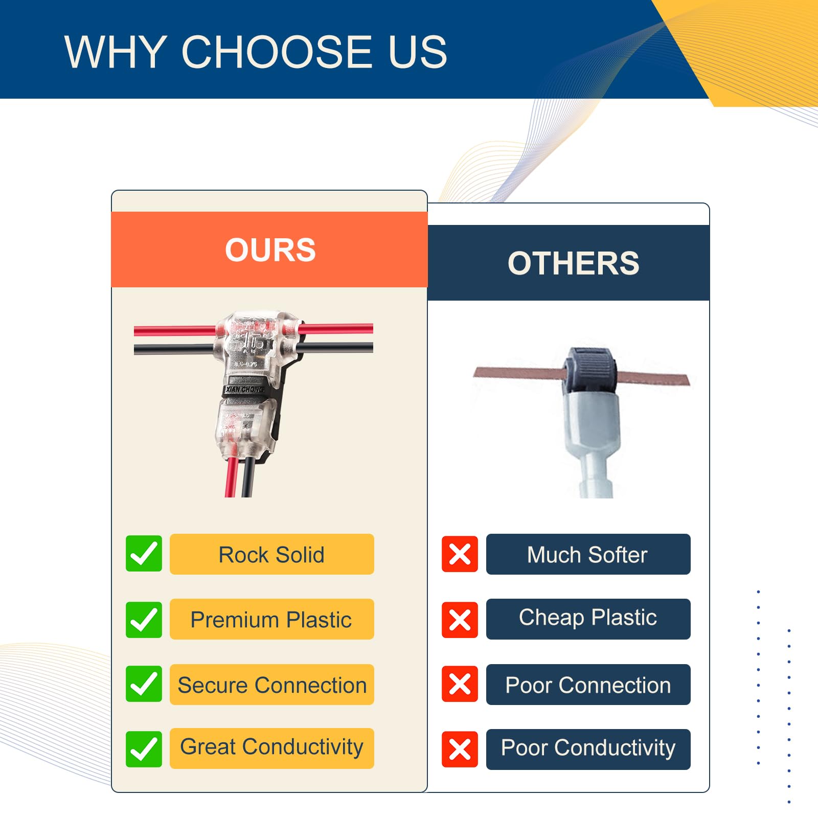 ROCK SOLID CONNECTION - Brightfour low voltage wire connector solves the problem that many connectors become loose because of the varying temperatures etc. After a few tests, you will see our wire splice connectors still hold tight, and keeps good contact. They stand out with reliable secure connection than other 3 way wire connector.