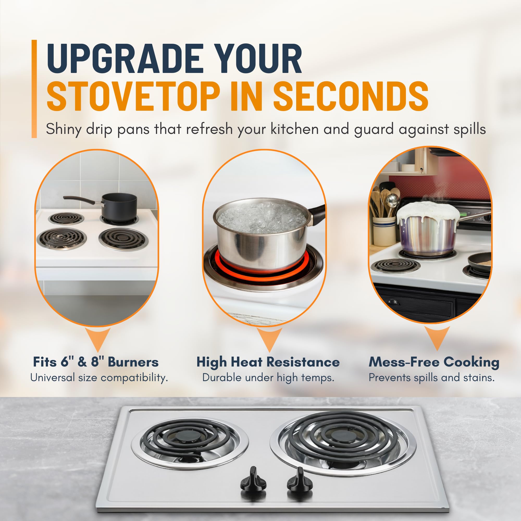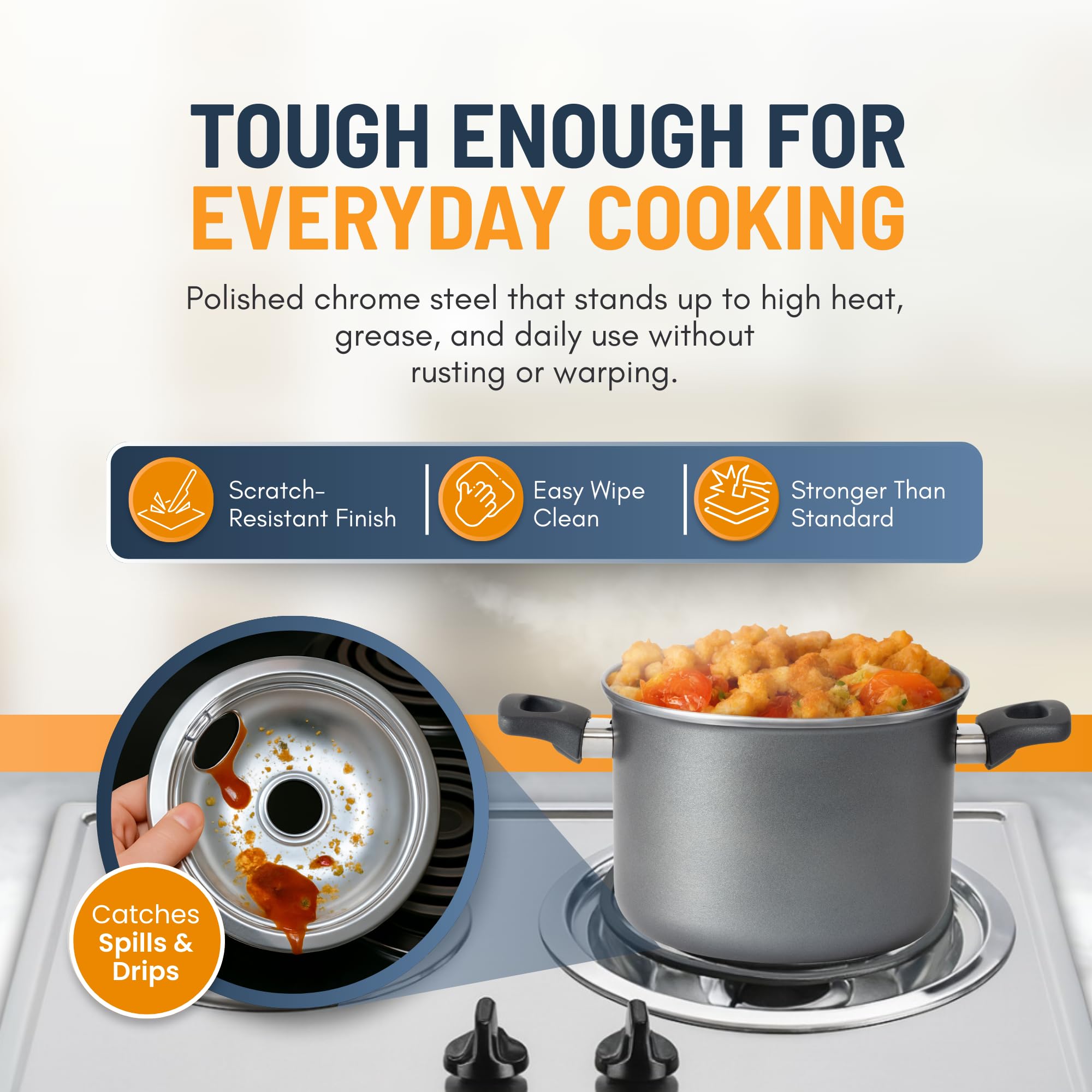 DURABLE & COST-EFFECTIVE UPGRADE - Built from heavy-duty steel with a polished chrome finish, our stove top drip pans resist warping, discoloration, and corrosion to handle everyday cooking with ease. Instead of replacing your entire stove, simply swap in new drip bowls for electric stove for a cost-effective upgrade that restores both function and appearance.