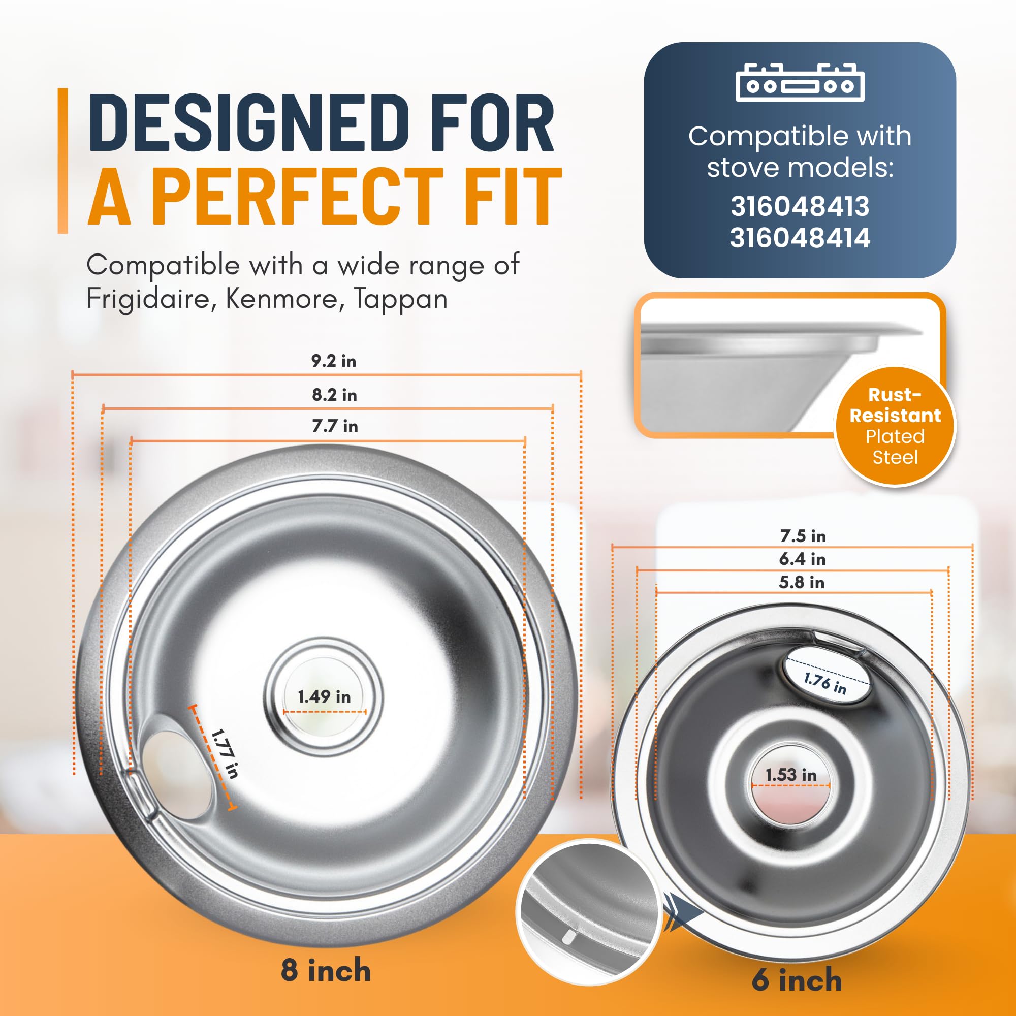 PERFECT FIT & EASY INSTALLATION - Designed for a seamless fit with models 316048413 and 316048414, our stove drip pans for electric stove top work with a wide range of Frigidaire, Kenmore, Tappan, Gibson, Crosley, and White-Westinghouse ranges. Simply remove old oven drip pans and drop these in - no tools required. Please check your stove model and pan sizes before purchasing to ensure the proper fit.