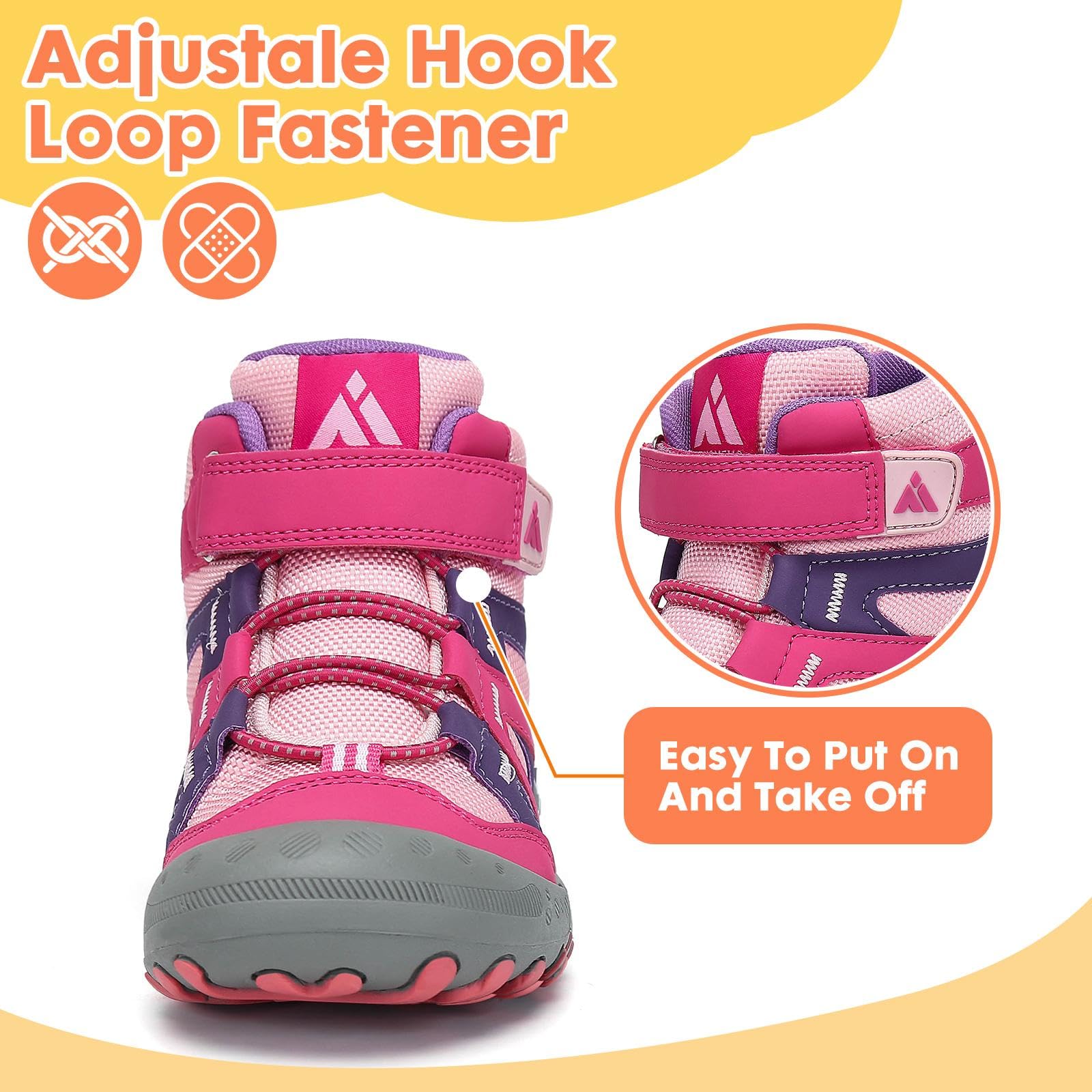 EASY ON AND OFF: Girls boys hiking shoes are designed with hook-and-loop strap and elastic adjustable buckle provides child a secure fit and easy to put on and take off.