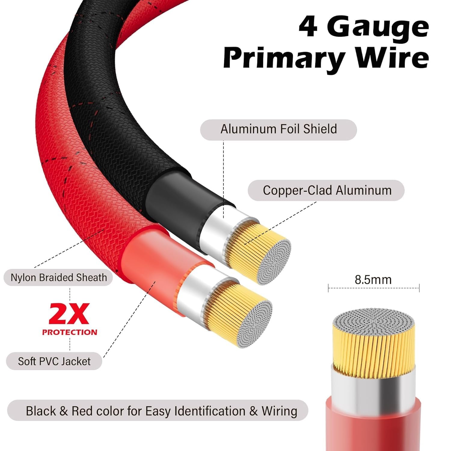 Shielded High-Quality Power Transmission: Made with high-quality 4 AWG Copper-Clad Aluminum (CCA) to ensure superior and stable power transmission. Featuring an aluminum foil shielding layer, it resists electromagnetic interference, unlike the common unshielded cables in the market. The copper-clad aluminum design is both lightweight and flexible, making it suitable for various high-efficiency power transmission needs, especially in automotive, home theater, and radio devices