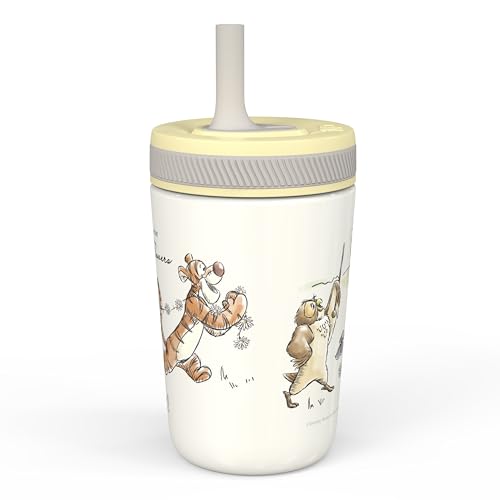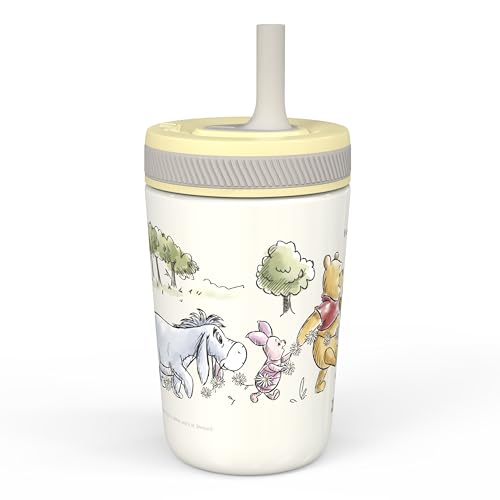 This leak-proof tumbler from Zak Designs makes hydration fun for any Winnie the Pooh fan! Durable Materials: The tumbler is made from food-grade, 18/8 stainless steel, and the comfortable straw is made from silicone. The lid can be disassembled for easy cleaning in the top rack of the dishwasher. Leak-Proof Straw: The straw spout has a built-in valve that allows liquid to flow when drinking and prevents spills when the tumbler is tipped over. It's perfect for travel or for young children graduating from sippy cups. Vacuum Insulation: The stainless steel tumbler has vacuum insulation that keeps drinks cold for up to 10 hours, so water stays refreshingly chilled. The double-wall construction also prevents condensation from forming on the outer walls, eliminating messy water rings. Hydrate Anywhere: The tumbler won't splash or leak and fits in car cup holders, making it ideal to take on the go. At home, you don't have to worry about spills or stains around fabrics or electronics, and drinks stay easily accessible through the straw. Specifications: 12 oz capacity. Vacuum insulated. Made of durable stainless steel and silicone. Top rack dishwasher safe, do not microwave. Length: 3.2-inch, Width: 3.2-inch, Height: 6.77-inch. Character: Winnie the Pooh, Tigger, Piglet, Eeyore, Owl (Disney's Winnie the Pooh). Recommended for ages 3+.