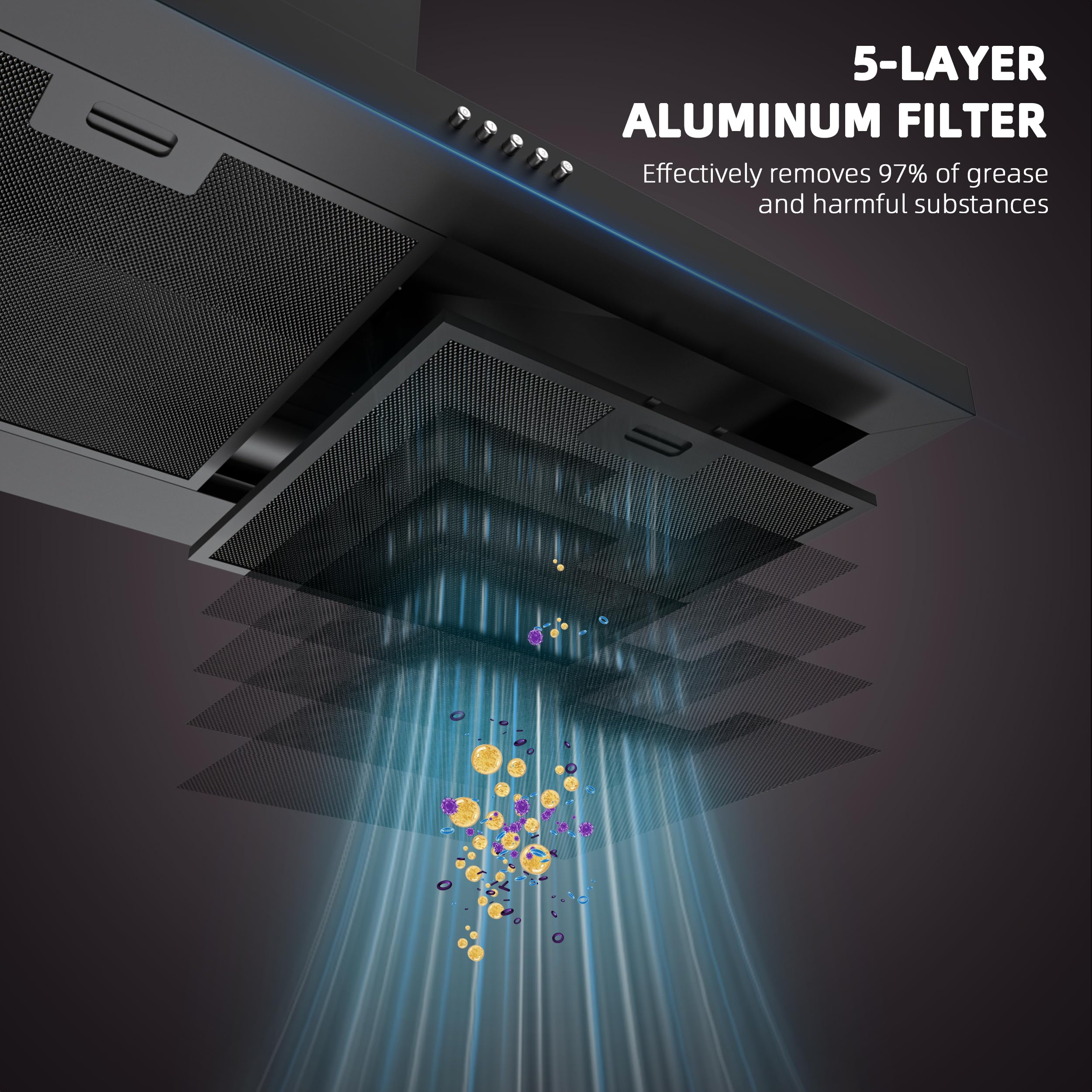 VERY SLEEK AND EASY TO CLEAN: The Black painted stainless steel stove vent hood made with food-grade,durable,non-rusting brushed high-quality 430 black stainless steel that resists grease, stains or rusts which material thickness is better than others. Black kitchen hood with superior multi-layer filters (#model: FGS-TF2290-LW ) trap grease and oil more effectively, dishwasher safe and reusable