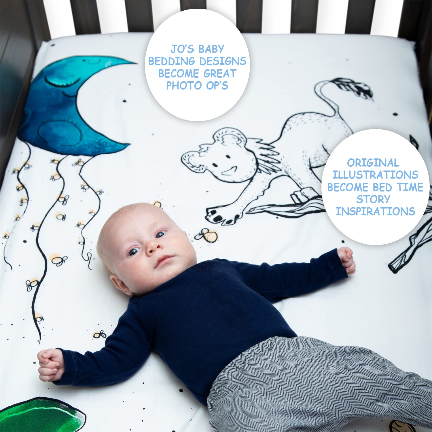 Snugly Fitted - JumpOff Jo 52 x 28 inches cotton crib sheets are fully elasticized for a secure fit on standard crib mattresses and toddler beds. Fitted sheets stay snug all night for your baby’s comfort.