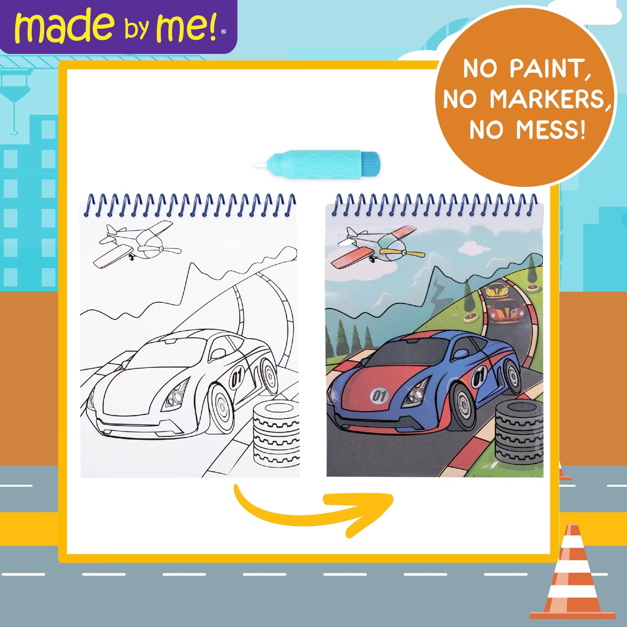 Zoom into a world of creative fun with the latest in paint with water books for kids by Horizon Group USA: Made By Me On-the-Go Aqua Art — it’s no-mess painting for kids! This 4-page water activity book puts an exciting twist on traditional coloring books. Use a chunky, easy-to-hold water brush pen to transform blank pages into colorful worlds, from construction zones to racetracks and even sailboat adventures! Simply unscrew the brush pen, fill it with water, and watch the pages burst with color after every stroke! Follow the prompts for more adventures, like counting cones, searching for boats, and even revealing puppy dogs in a city! Every page inside this spiral-bound watercolor book features interactive activities and toddler arts and crafts to enjoy over and over — once the water dries, refill the pen and color again! Small enough to bring on the go but large enough to keep kids occupied, our Aqua Art toddler water toys are a great choice, checking all the boxes when it comes to easy kids travel activities, toddler car activities, or toddler plane activities. This transportation-themed mess-free toddler coloring book is an ideal travel toy for kids ages 3 and older.