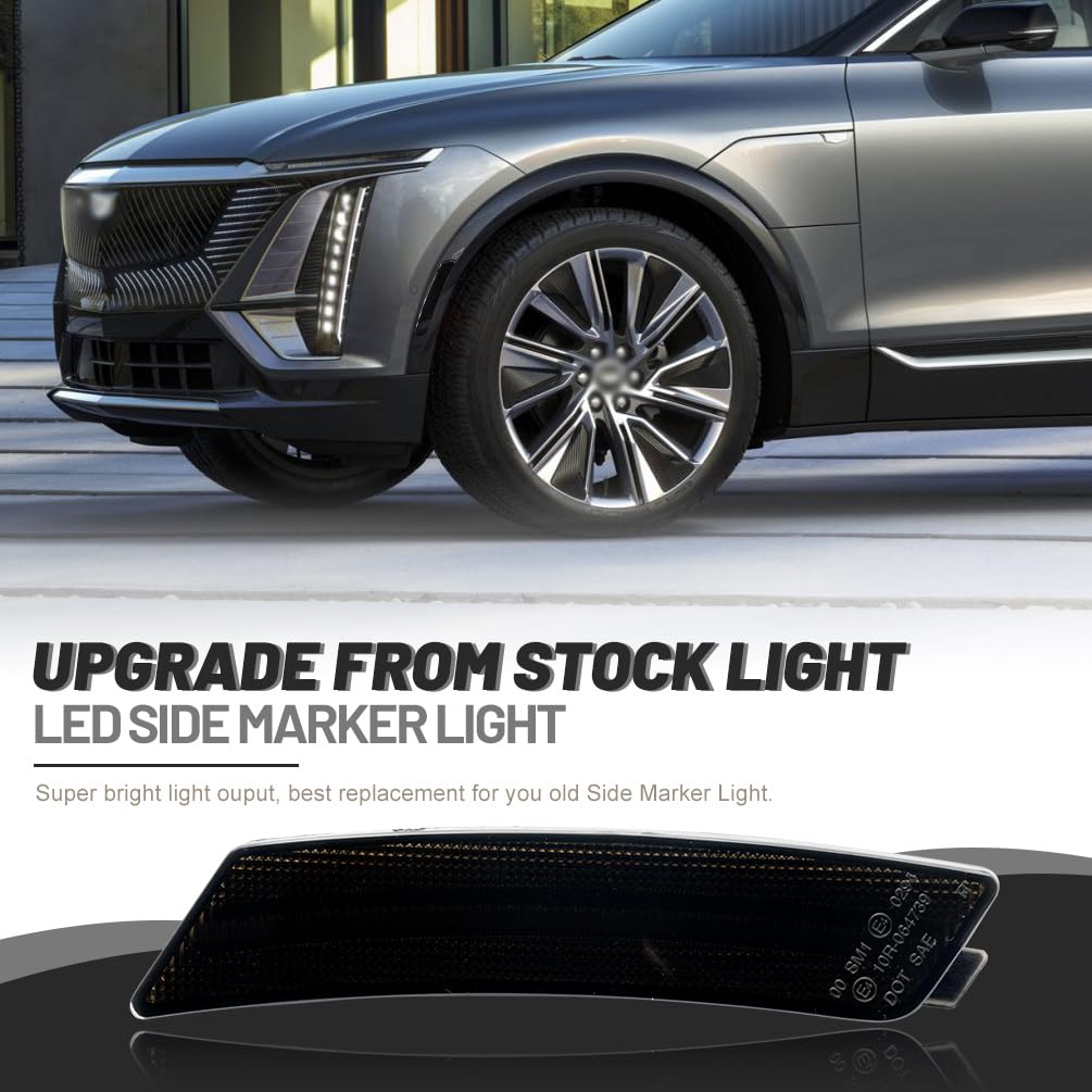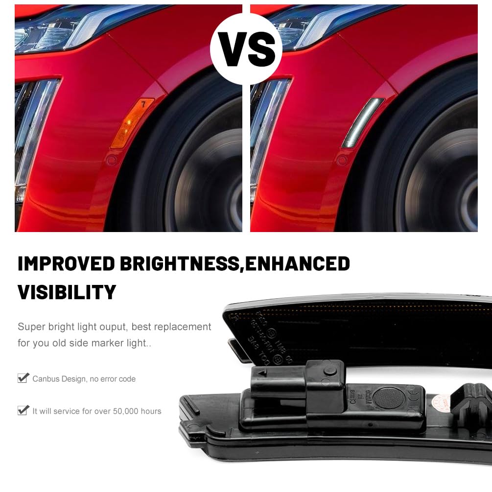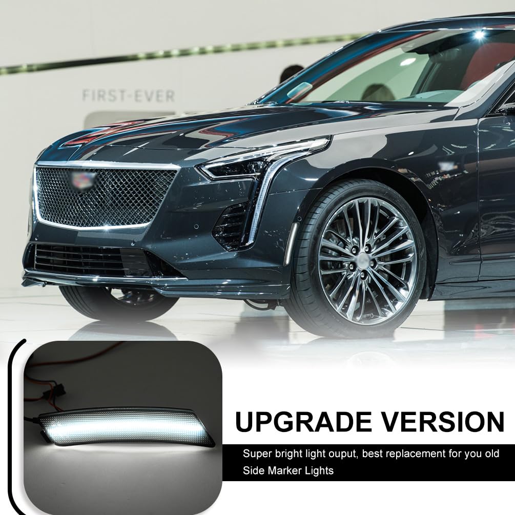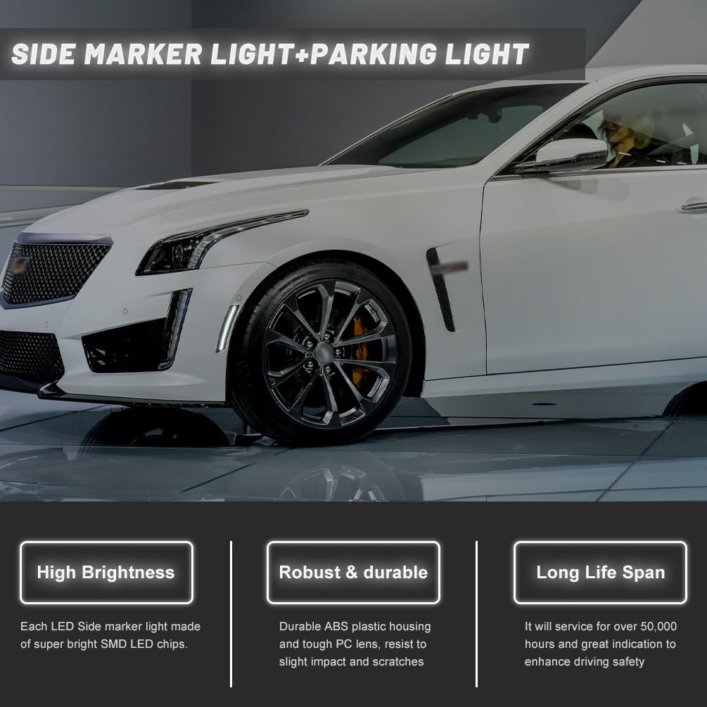 Function: Compatible with 2020 2021 2022 2023 Cadilla.c CT5. Upgrade your CT5 side markers with a new fashion style smoked lens look and brighter white LED lighting. Elevates your muscle car's aura and even adds additional safety visibility driving signal features