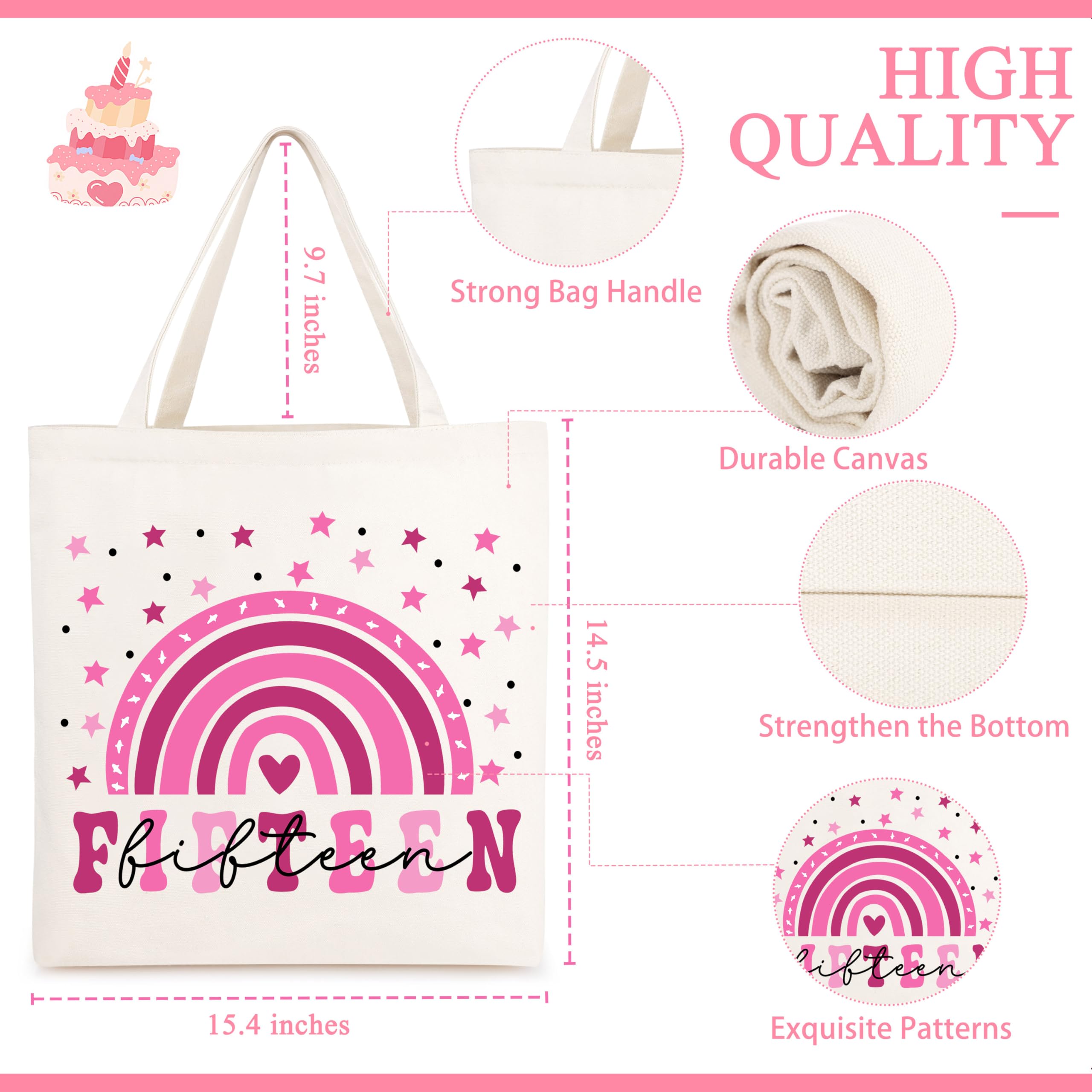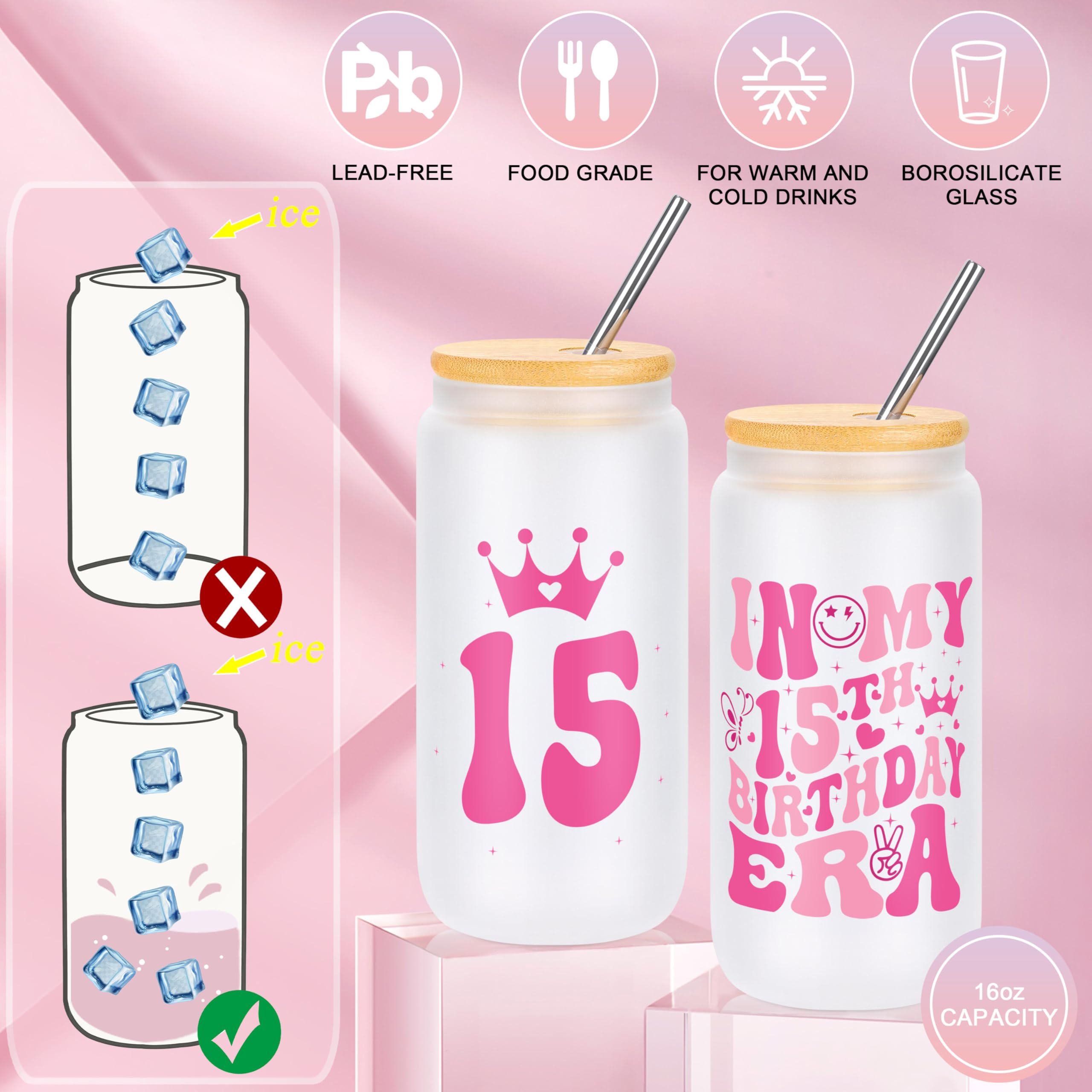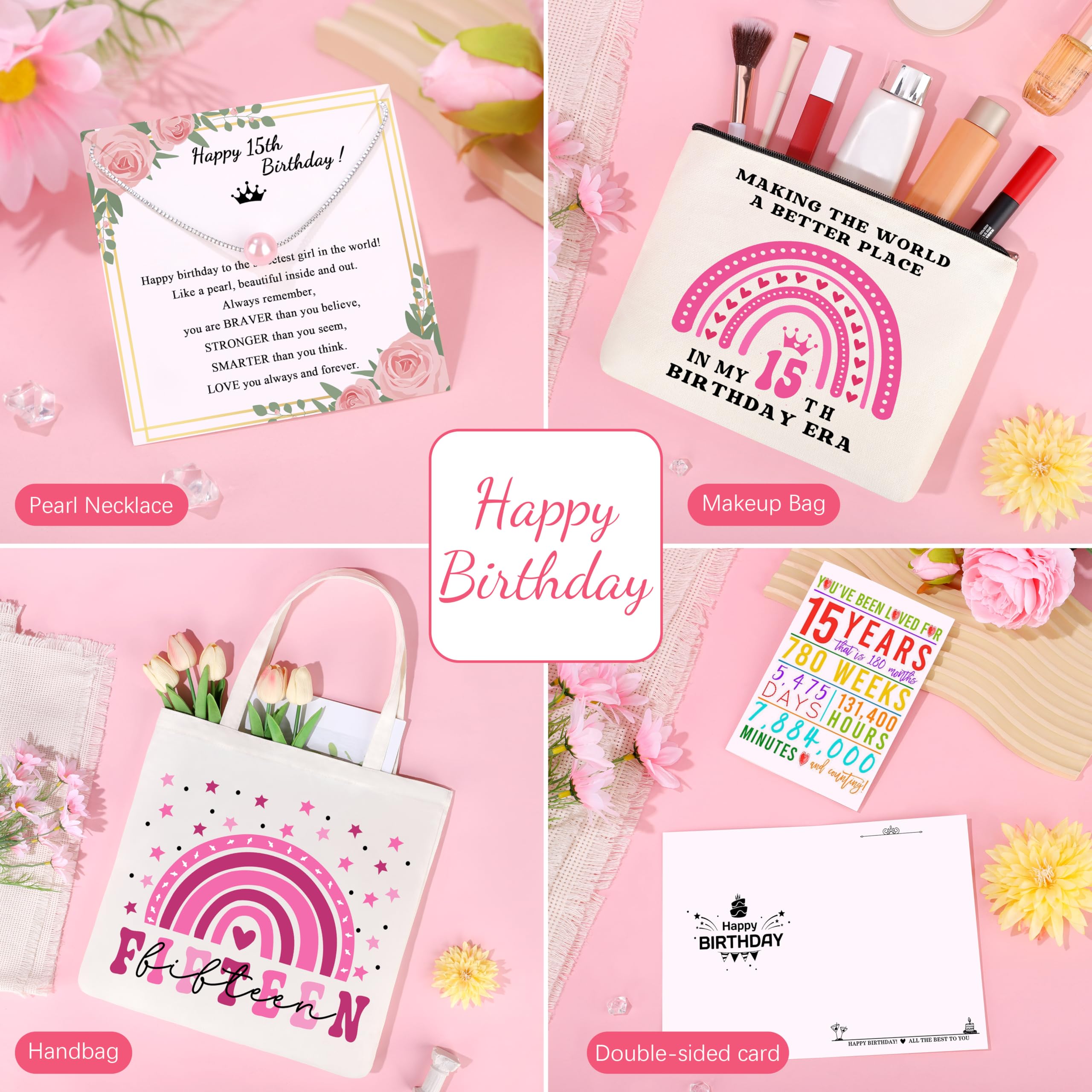 đăGifts for 15 Year Old Beautiful Teen GirlăBirthday 6 piece set includes 1 x exquisite patterns, fashionable handbag, 1 x In my birthday era makeup bag, 1 x 16 Oz can glass with lid and straw, 1 x Socks made of pure cotton, unique design and cute style, 1 x heartfelt congratulations card on kraft paper and 1 x stylish pearl necklace with a souvenir card.