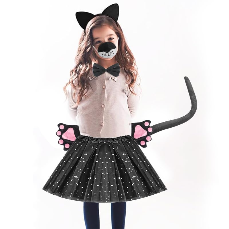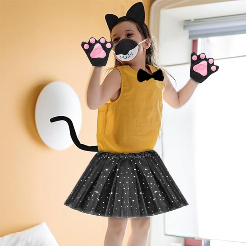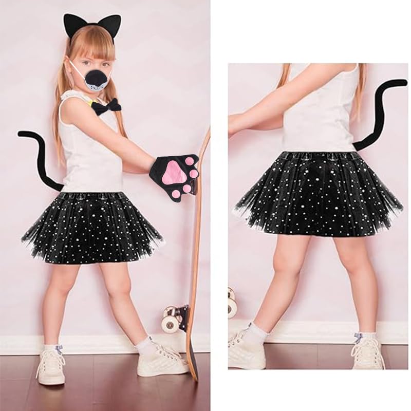 Cat Costume For Kids Wear Comfortably: The cat costume for girls made of durable thick plastic and quality velvet for comfort. The newly designed tail can not only be clipped on the clothes, but also can be designed as you want.multi-level black star skirt makes you more touching