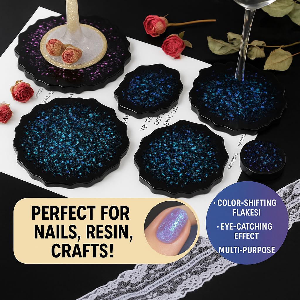 【 💙 HOLOGRAPHIC FLAKES EFFECT 】- Brush the molds with a thin layer with chameleon flakes for epoxy, otherwise, it will waste flakes and diminish the effect. To get the best color shifting effect, brush it on the resin molds and pour black resin. You'll need just a little to produce rich and vivid colors!