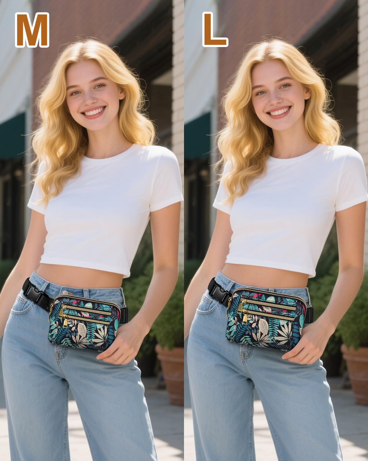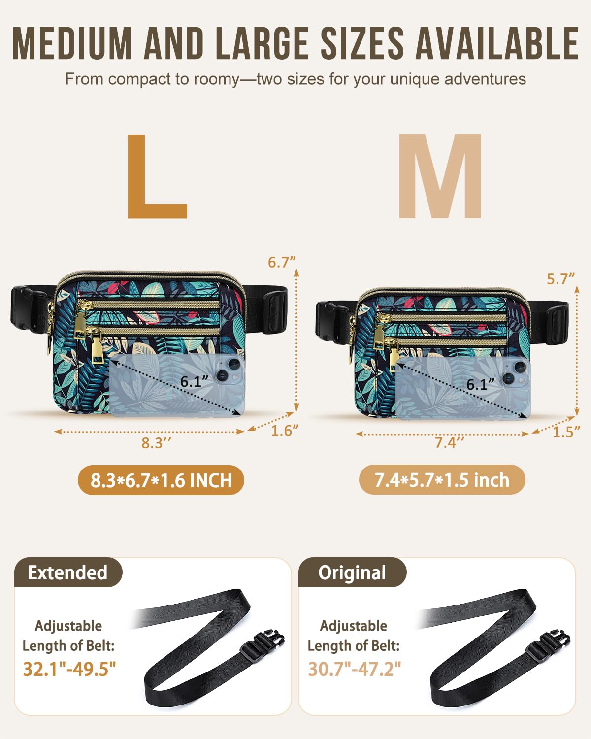 Large Capacity with 4 Zipper Pockets: Our waist packs are available in 2 sizes( L: 8.3*6.7*1.6Inch; M: 7.4*5.7*1.5Inch). Please measure your waist before purchasing. Features 2 roomy compartments and 2 mesh slots, so all your essentials stay neatly organized and easily accessible. Say goodbye to digging through your bag! 2 zippered front pockets are designed to store keys and cards without worrying about the keys scratching your phone