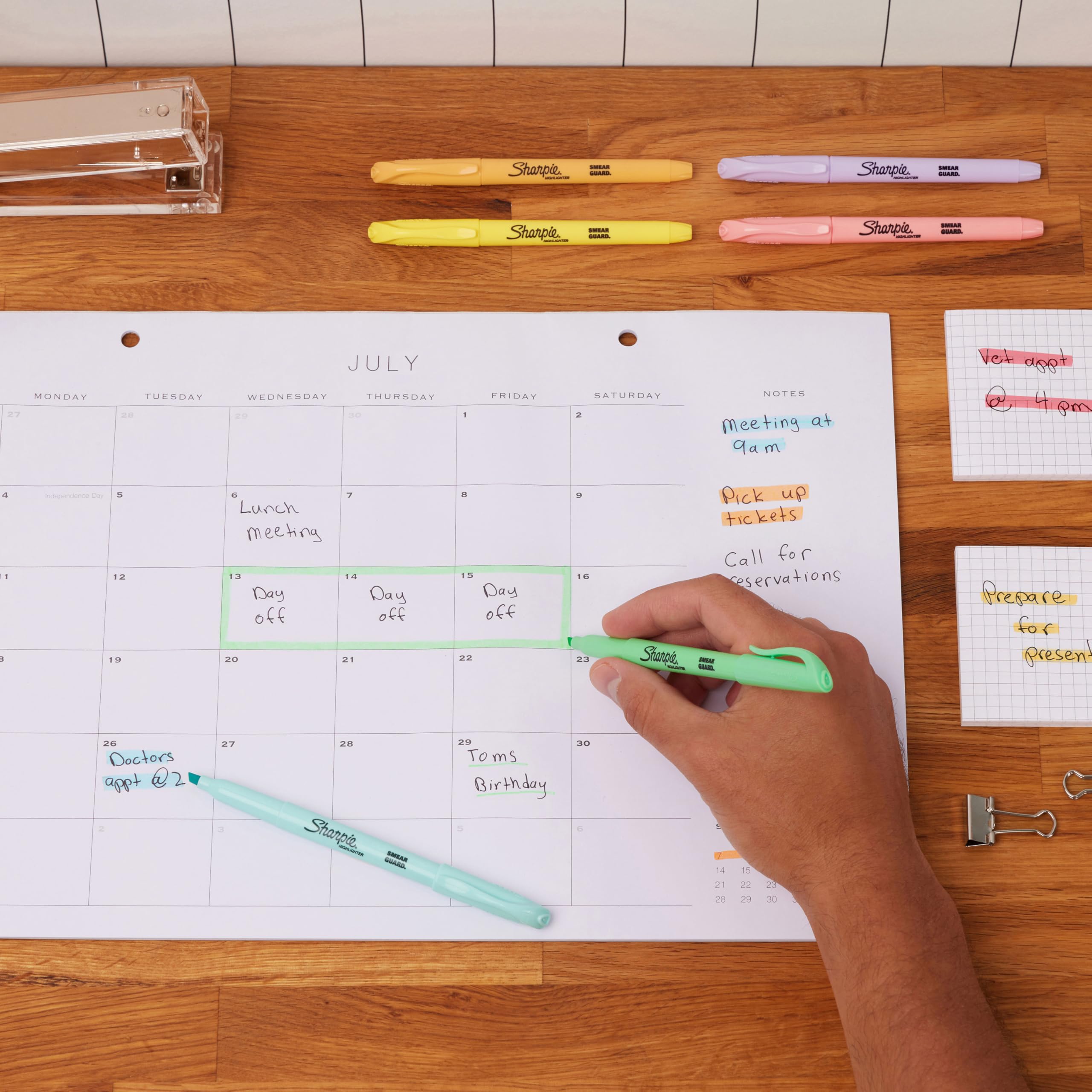 Perfect for when info is high priority and precision is a must, Sharpie Highlighters make everything highly visible with transparent, smooth, and quick-drying ink. These versatile pocket highlighters are designed to fit effortlessly in your pocket or clip to your shirt for easy, on-the-go highlighting. The quick-drying ink resists smearing many pen or marker inks, while the versatile chisel tip highlights and underlines both wide and narrow lines of text. And with an array of mild, pastel colors, these Sharpie highlighters are perfect for softer highlighting that still stands out on the page. Itβs no wonder why Sharpie is the got-to-have highlighter for lifeβs major high points.