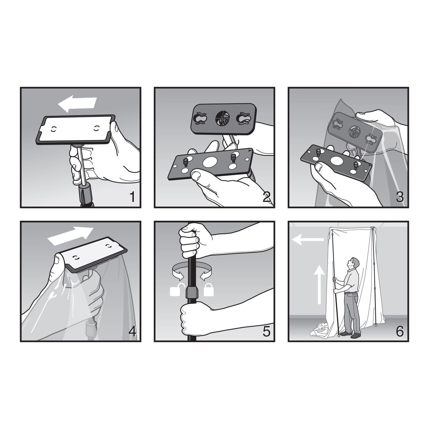 Easy Installation: Each pole takes seconds to set up without the use of ladders. In addition to protecting the ceiling, the non-skid and non-marking head securely locks the barrier material and raises it along with the pole.