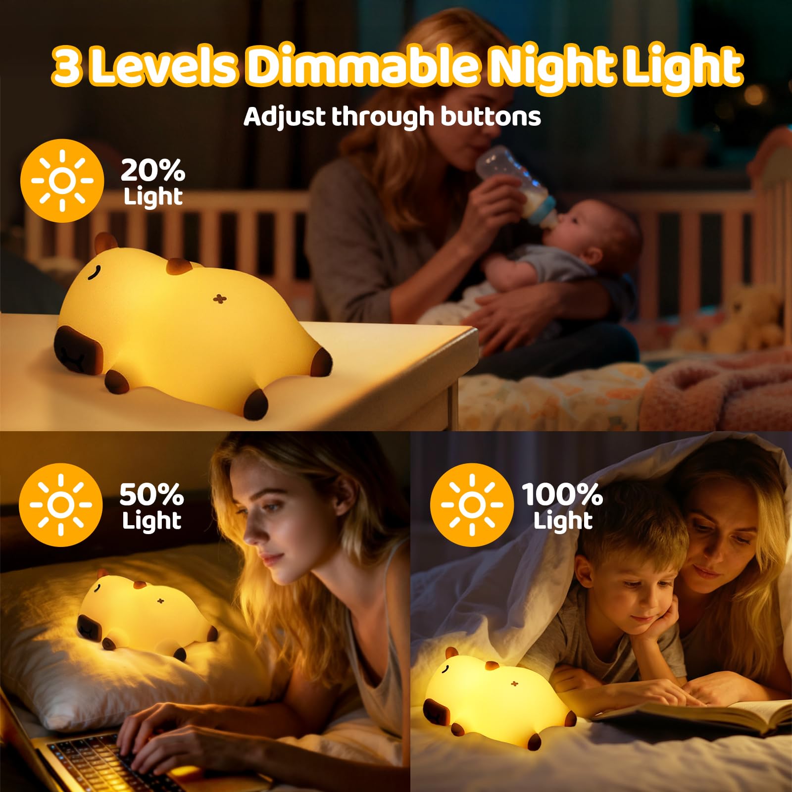 SMART 3-LEVEL DIMMABLE & PORTABLE DESIGN-You can adjust the three brightness levels (20%, 50%, 100%) via the button at the bottom of the cute capybara night light. These three levels of soft light meet your daily needs—whether it’s for nighttime feeding, diaper changes, getting up to use the toilet, or bedtime stories. The capybara light‘s compact size also makes it perfect for lighting during camping trips or outings.