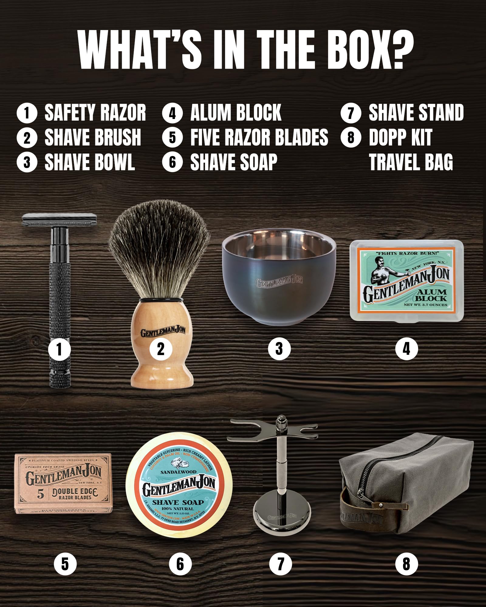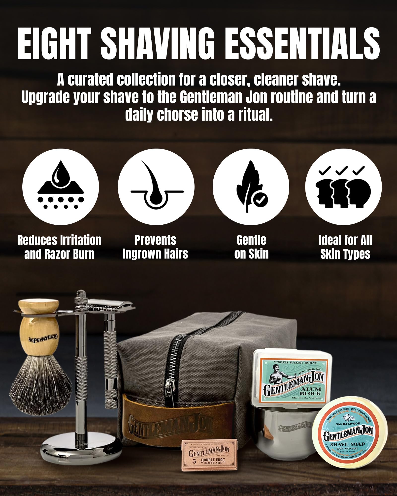 COMPLETE MEN'S SHAVING KIT: The Gentleman Jon Shaving Kit for Men is a comprehensive set that includes a safety razor, badger hair brush, alum block, shave soap, stainless steel bowl, shaving stand, canvas & leather dopp kit, and five razor blades - everything needed for a luxurious, comfortable and smooth wet shave experience. With its compact design, our product is also a suitable travel companion to those who value traditional shaving, ensuring a neat shave even while on the go.