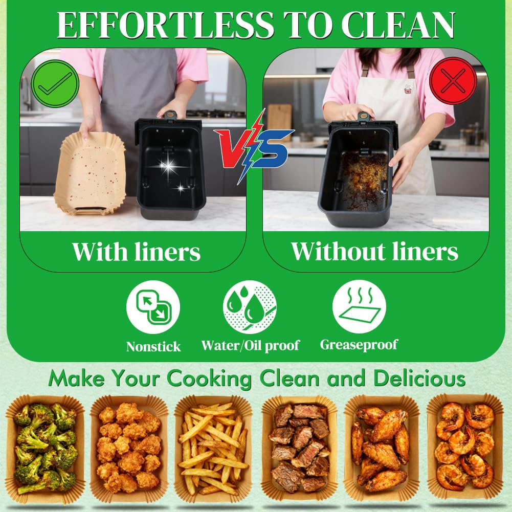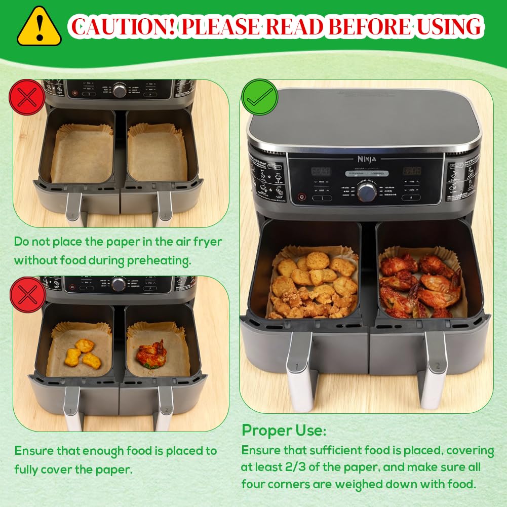 Wide Compatibility: Perfectly sized rectangle air fryer paper liners fit Ninja DZ550/ DZ201/ DZ401/ DZ302 dual air fryer, Ninja SL401 double stack air fryer, Bella 4QT/6QT slim air fryer, Chefman 6QT/9QT dual air fryer, and other double-basket or rectangle basket airfryers