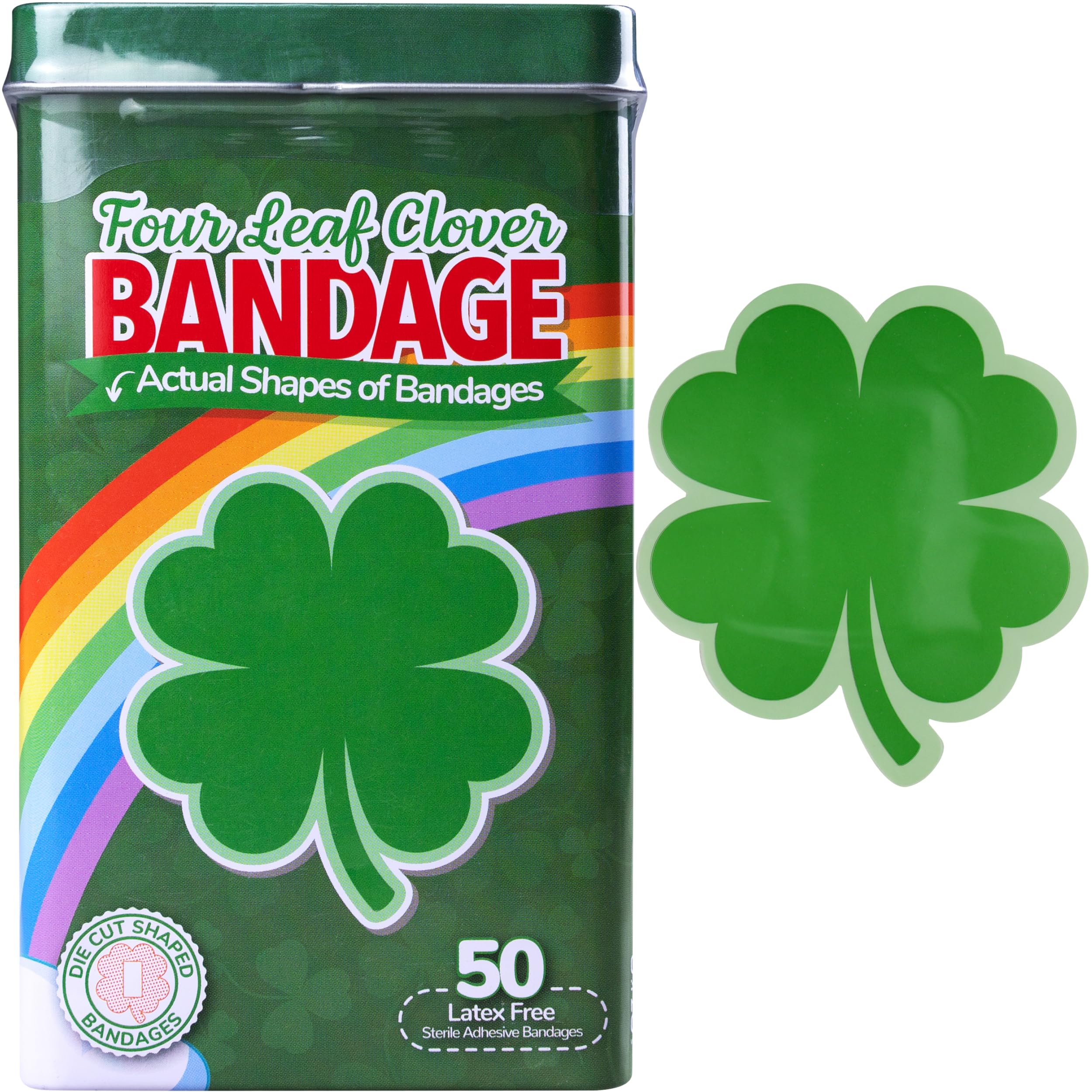 50 FOUR LEAF CLOVER KIDS BANDAGES: Fun 4 leaf clover-shaped adhesive bandages tin helps protect cuts, scrapes, and minor wounds while making healing less stressful for children