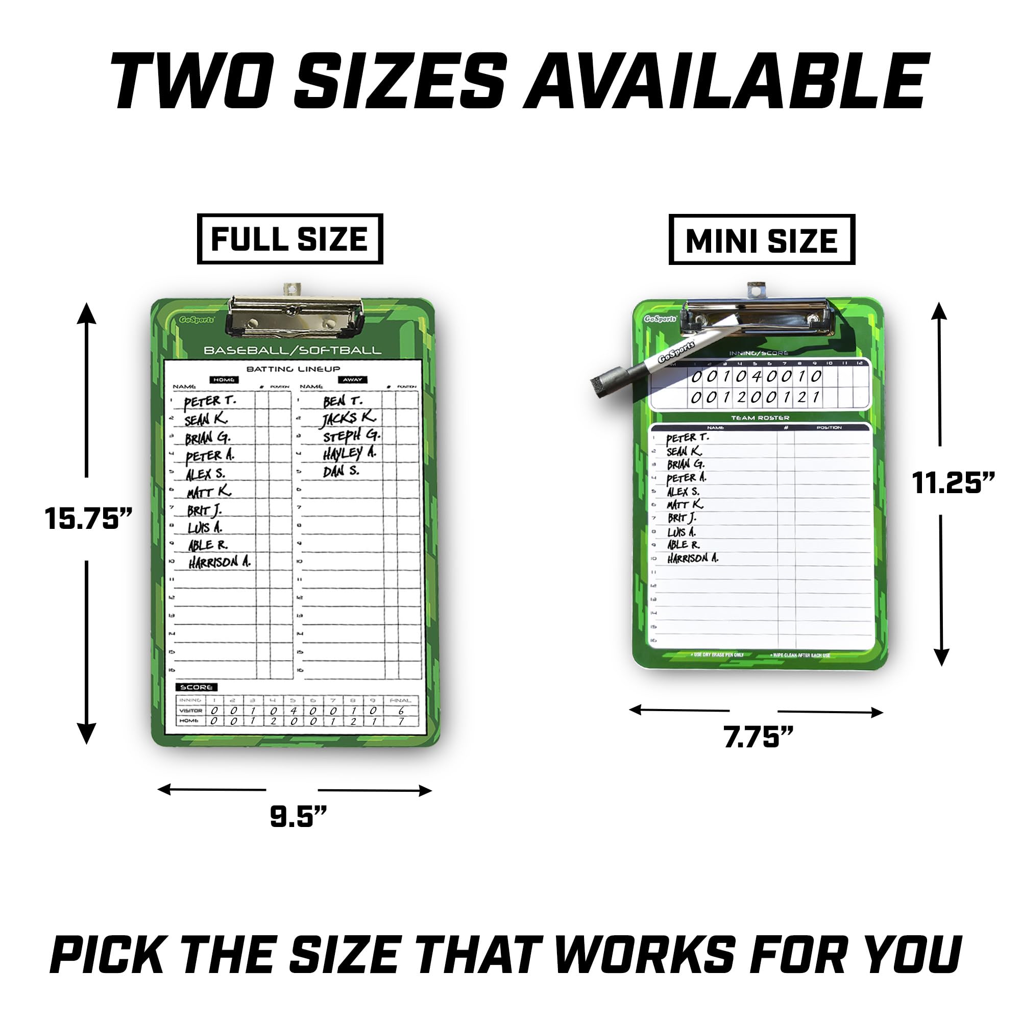 Must-have for any baseball or softball team to easily keep track of team lineups. The board measures 11 in x 7.5 in which makes it easy to read while also extremely portable. It includes a carabiner to hook it onto the dugout fence and 2 dry erase pens.