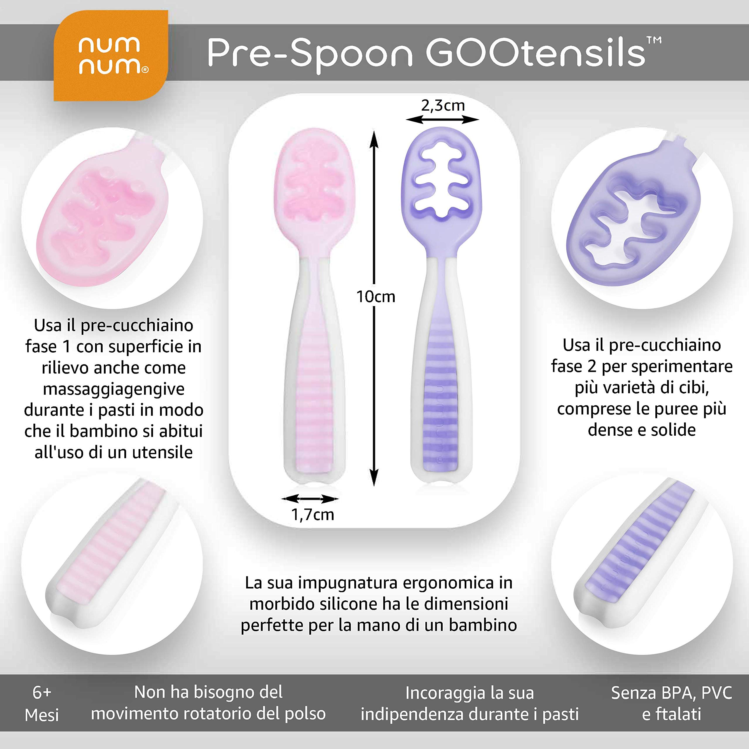 EASY SELF-FEEDING FOR THE FIRST STAGE Make the starting solids transition easier (and more fun) for baby. Each set comes with a pre-spoon perfect for purees, doubling as a teether for sore gums, along with an open-channel spoon designed to grip soft solids. These spoons help teach the skills and motions needed to graduate to a traditional spoon, without requiring wrist rotation to use, a skill children typically do not develop until 2 years old. Caregivers love how these spoons reduce mealtime mess and frustration.