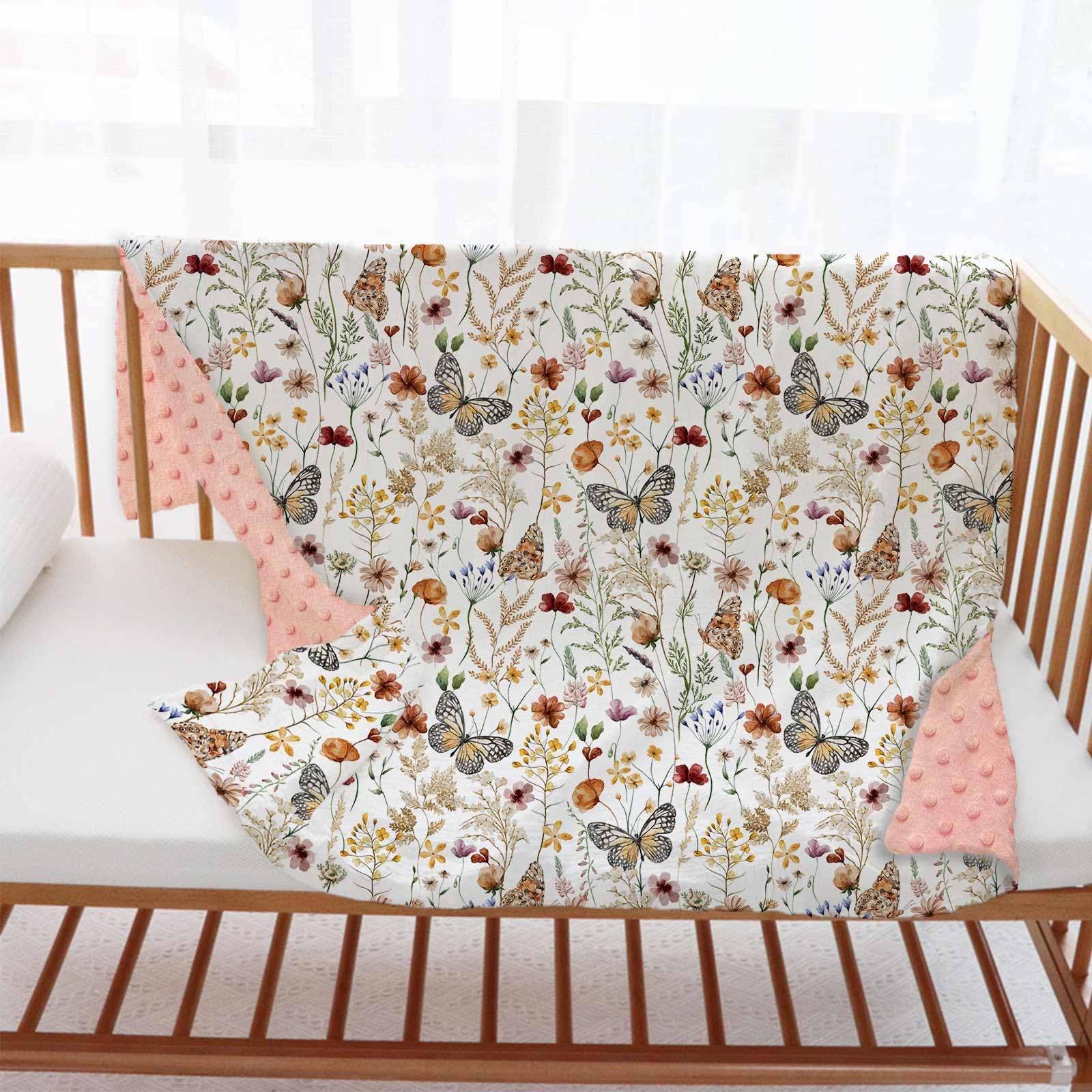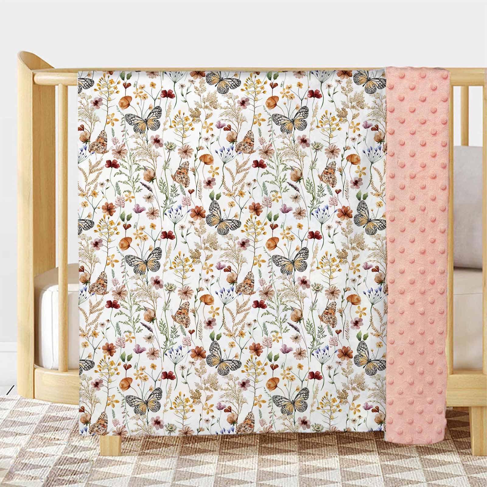 Wildflower Butterfly Baby Blanket for Girls, Soft Double Layer Minky with Dotted Backing, Flower Garden Theme Toddler Nursery, Newborn Infant Toddler Crib Bedding, Receiving Blankets, 30"x40"