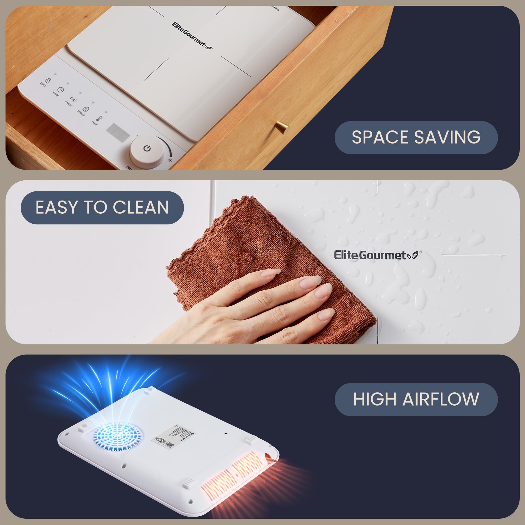 The Elite Gourmet EIND57W Digital Induction Cooktop brings precision, safety, and efficiency to your kitchen in a sleek, modern design. With 10 adjustable power levels ranging from 600 to 1500 watts and temperatures from 140°F to 465°F, you can simmer sauces, sear meats, or boil water with perfect control. The soft touch controls make it easy to adjust heat or set the 1-minute to 3-hour timer for hassle-free, hands-free cooking. Crafted with a durable, shatter-proof ceramic glass top, this induction cooktop is both stylish and built to last—resistant to heat and easy to clean after every use. Its slim design offers a low profile for stability, compact storage, and ease of use, while the energy-efficient technology transfers over 85% of its power directly to your cookware, ensuring fast, even heating without wasting electricity or creating hot spots. Whether in a home kitchen, dorm room, office, RV, or outdoor setup, the EIND57W Digital Induction Cooktop delivers consistent performance and reliability. Safety and convenience are at the heart of the Elite Gourmet design. The child safety lock, auto-pan detection, overheat protection, and automatic shut-off provide peace of mind while cooking. Backed by over 40 years of trusted quality, Elite Gourmet supports every product with a 1-year warranty and responsive, U.S.-based customer care—ready to help by phone, email, or chat whenever you need assistance.