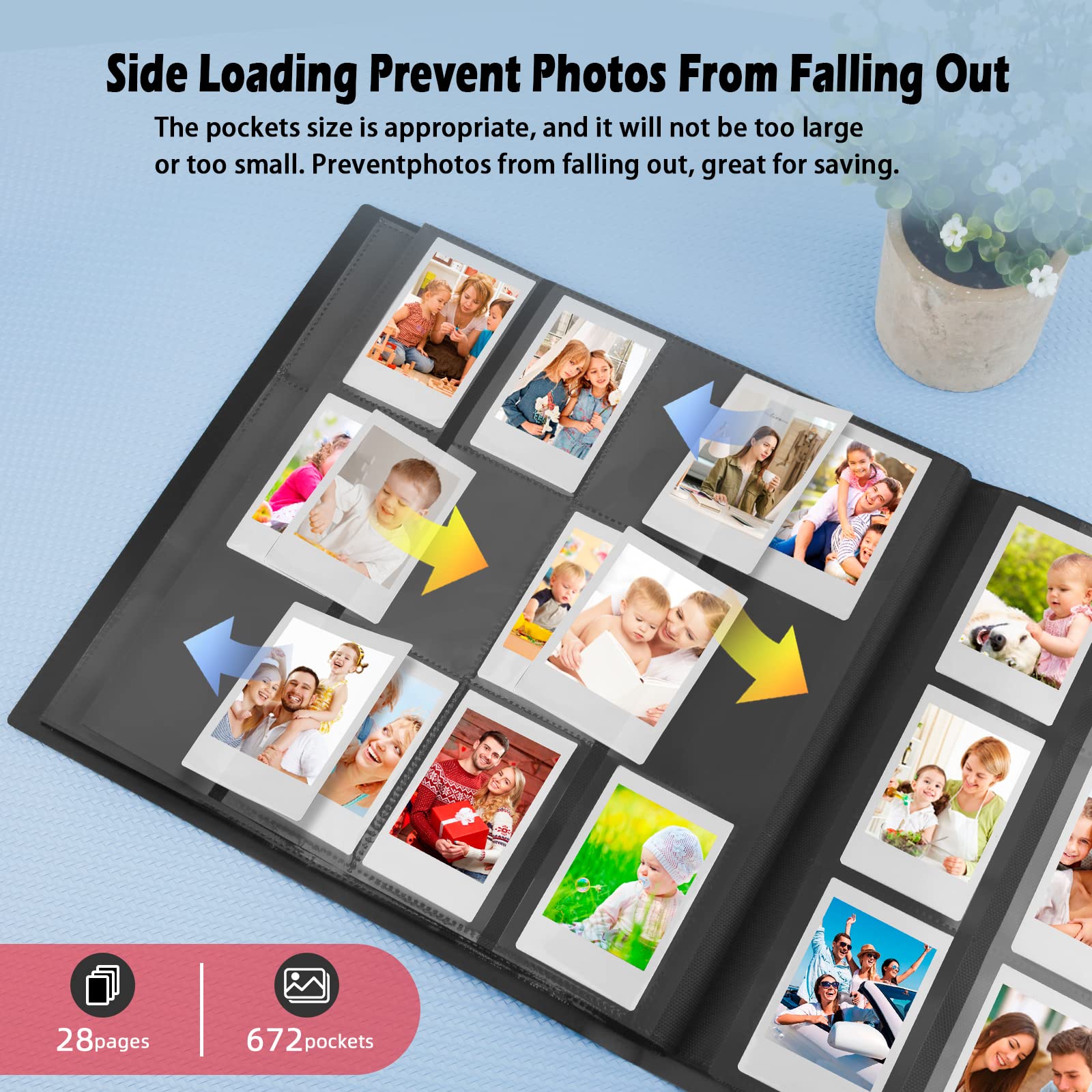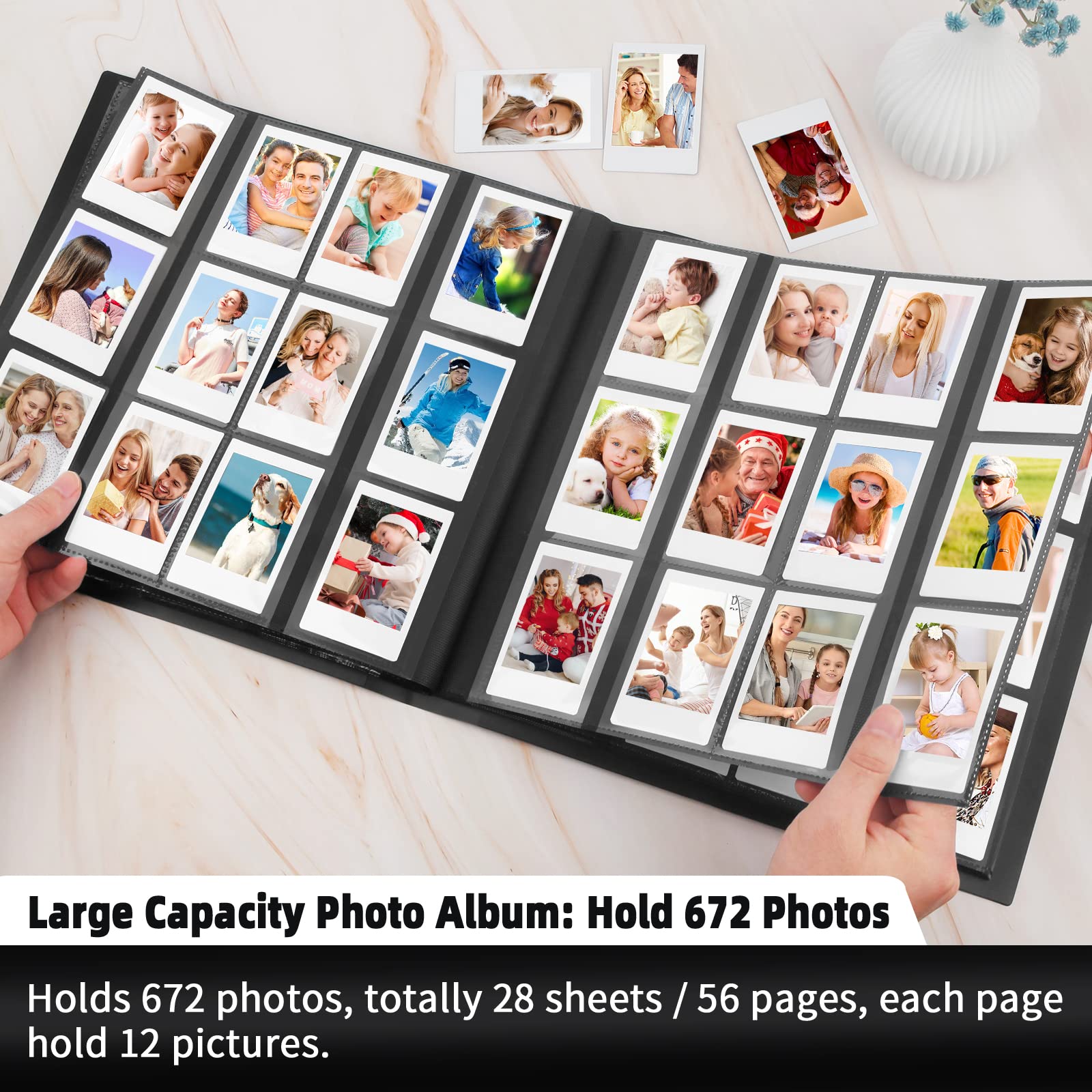 LARGE CAPACITY- STORE 672 PHOTOS Hold 672 films in total, for mini photo album contains 56 individual pages with 12 photos per page, opens like a book for easy viewing. A great way to keep your prized collection organized and in great condition.