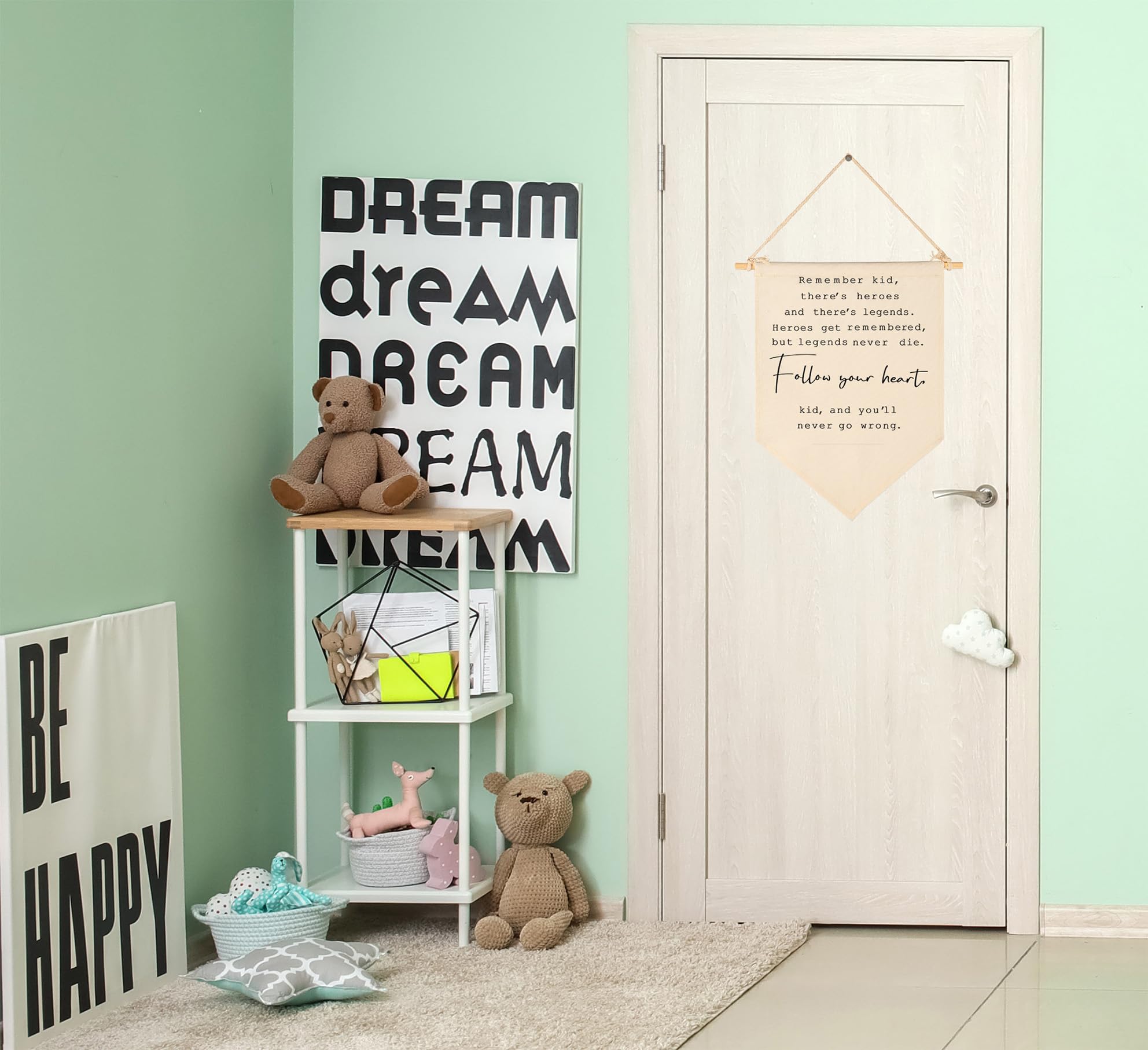 Crafted from natural cotton canvas, this 15.4 x 11 inch nursery wall banner brings a soft and calming touch to baby room, above crib or toddler space. The durable fabric keeps its shape with a natural texture, while the clear print stays bright with everyday use. Lightweight and easy to hang, it comes with a wooden dowel and pre-tied twine for quick setup on walls, doors or shelves. The versatile size fits small spaces without feeling crowded, making it perfect for creating a cozy nursery atmosphere. A thoughtful gift for baby showers, newborn arrival or first birthday.
