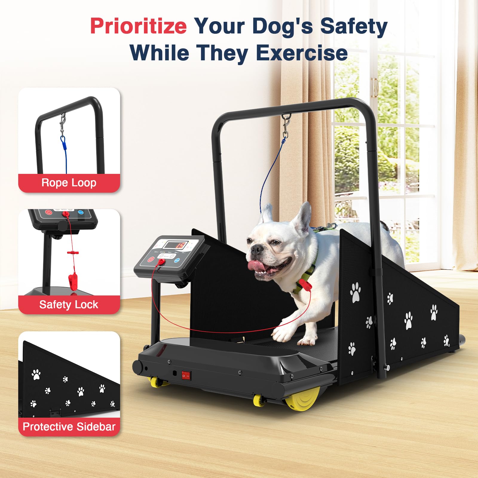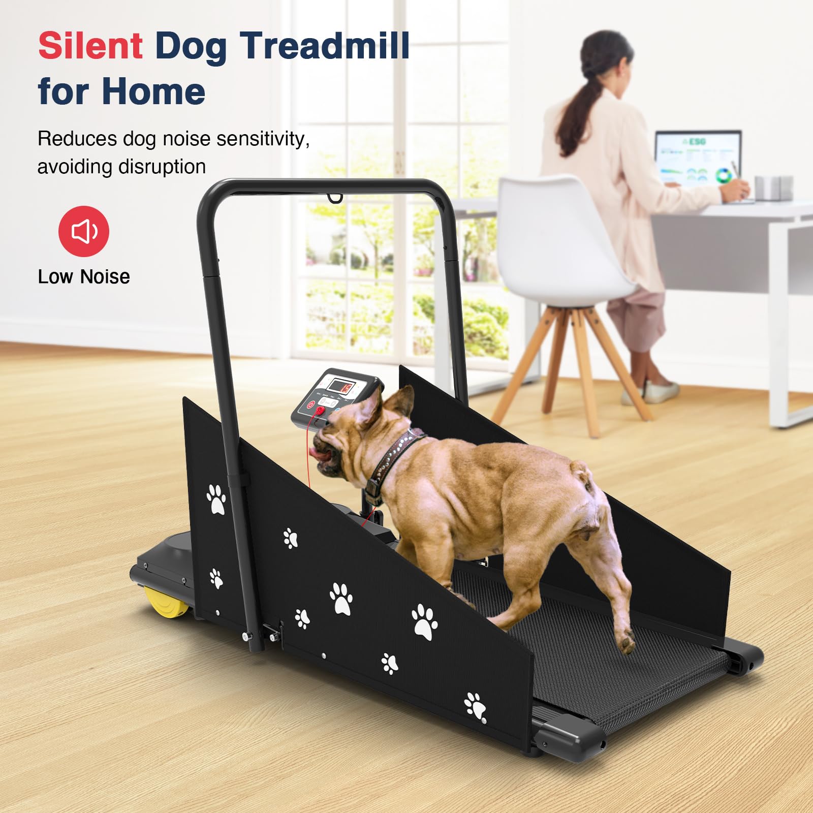 【Quiet & Secure Design】 - Built with a quiet motor to ensure a calm, stress-free environment, this dog treadmill lets your dog exercise comfortably without noise distractions. The low running platform allows easy on-and-off access, while the dual side safety rails help block distractions, keeping your dog focused. Plus, the front crossbar provides a spot to attach a leash for added security — so your dog can run confidently and safely every time.